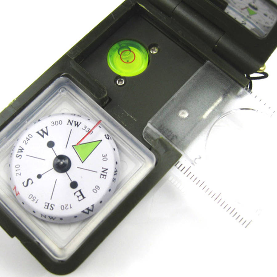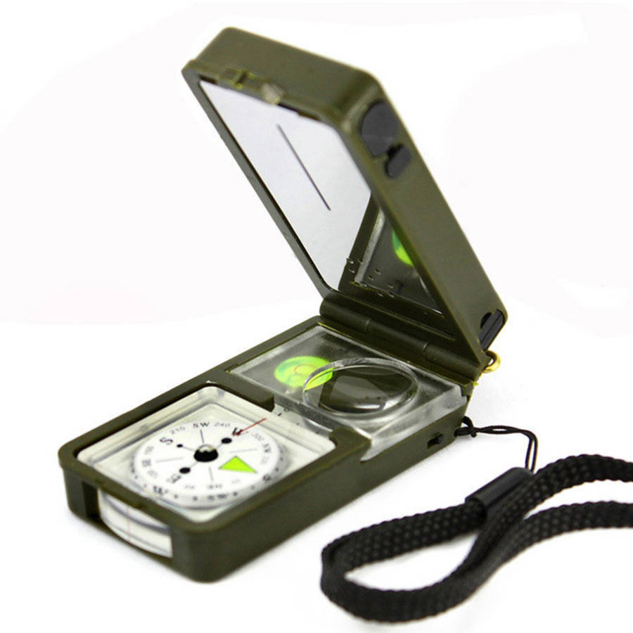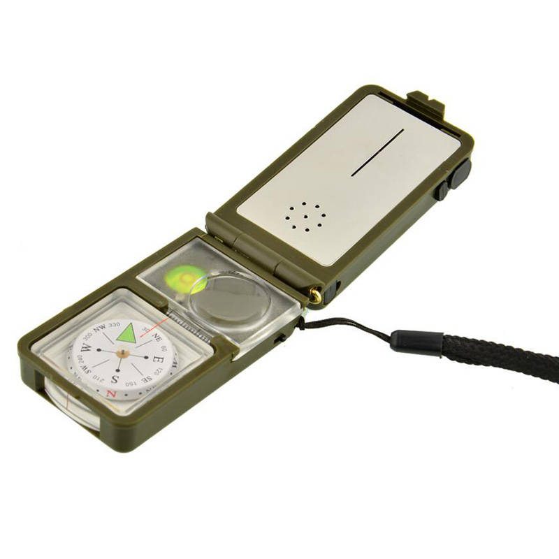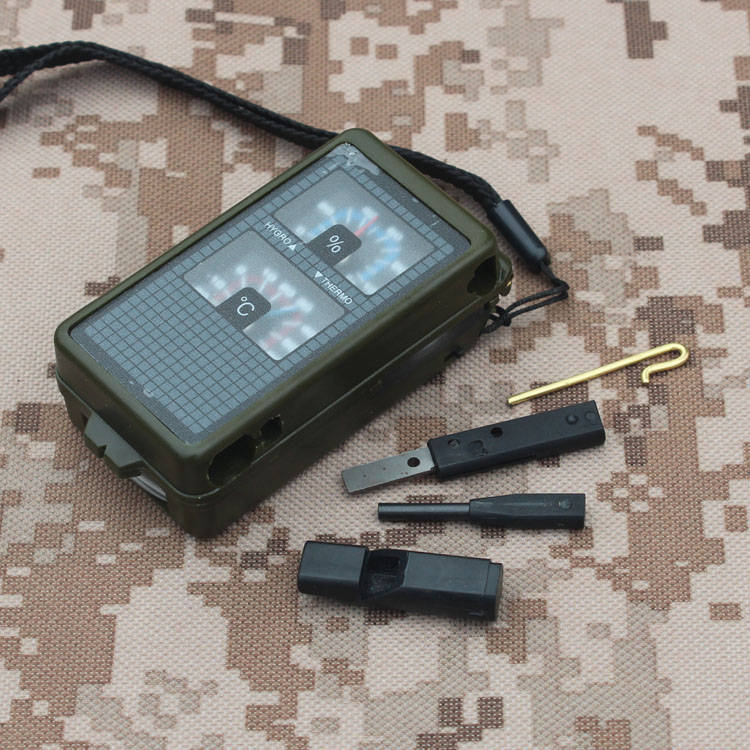 Functions: 1. Thermometer: Measure the temperature 2. Hygrometer: Measure environment relative humidity 3. Led light: Illumination(Battery can be replaced, just need to turn 3 screws) 4. Reflector: Outdoor SOS, reflect sunlight for optical signal 5. Horizon mirror: Level degree measurement 6. Compass: Magnetic azimuth measurement 7. Flintstone: Outdoor survival, make fire 8. Whistle: Outdoor for help, make a sound signal 9. Magnifying glass: Looking for coordinate on the map 10. Ruler: Measuring distance