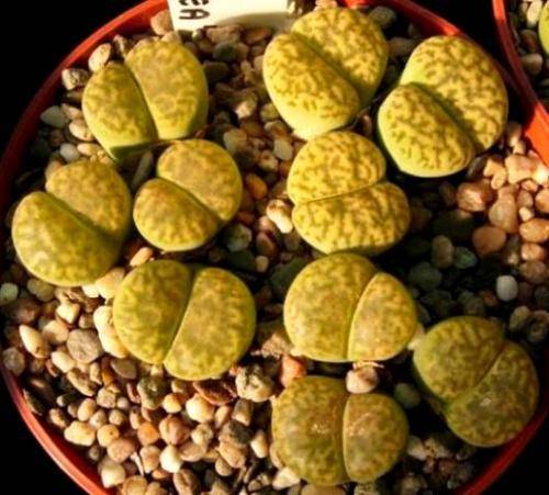 Lithops bromfieldii var sulphurea Seeds Family: Mesembryanthemaceae (Vygie Family) Lithops are probably the most well known and popular member of the large succulent plant family, the Mesembryanthemaceae. They are commonly called living stones or stone plants because they so closely resemble the surrounding pebbles of their natural habitat, either in coloration or shape or both. This camouflage allows them to escape detection and is a very effective strategy for escaping predation. Their resemblance to stones has also given the genus its scientific name: from the Greek lithos meaning stone and opsis meaning appearance or resemblance. They are known in Afrikaans as beeskloutjies, because the plants also look like miniature hoofprints of cattle. A lithops plant consists of a two-lobed, upside down cone-shaped, body that is in fact a fused and thickened pair of opposite leaves. The stem is very short and not visible. In their native habitat the leaf pair grows sunken in the gravely soil with only the upper portion visible. This part is called the window, and it allows light into the inner portion of the leaf where it is diffused before reaching the green chlorophyll, which is scattered along the inner leaf margins, where the process of photosynthesis is carried out. The leaf pair is replaced by a new one every year and the leaf sap is recycled from the older to the younger leaf pair, thus maximising on moisture and nutrient conservation. Lithops plants will produce more than one leaf pair so that a single body gradually becomes a smallish cluster. Each leaf pair will produce one solitary bright daisy-like flower during autumn. This flower is usually white or yellow in colour, about 25 mm in diameter, and appears in the fissure of the leaf pair. They open late in the day and close up again at dusk and could be pollinated by any number of bees, flies, wasps, gnats, bugs etc that are common in the area. You're buying a pack of 10 Seeds FUN & EDUCATIONAL SEEN IT..... NOW GROW IT! |