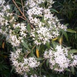 Pavetta lanceolata commonly known as Weeping Bride's Bush, Bridal Bush or Christmas Bush in English and Treurbruidsbos or Bruidsbos in Afrikaans in full flower, looks like a bride adorned in pure white, full of expectations and hope for a long and happy life, hence the common name. The alternative common name is also apt as these bushes are in full flower during Christmas time. Pavetta lanceolata is an evergreen tree or shrub, up to 5(7) m high, regularly decussately branched (opposite pair at right angles to next pair). The bark is greyish white. Pavetta lanceolata is fairly common in the summer rainfall areas of South Africa, in Limpopo, Mpumalanga, Swaziland, KwaZulu-Natal and the Eastern Cape. It also occurs in southern Mozambique. It often grows in association with other bushes in bush clumps, on forest margins and river banks. The sweetly scented flowers attract many pollinators such as birds, bees, wasps, beetles and ants. These in turn attract birds and other predators. Birds love the fruits and these are obviously distributed by birds. In the past, the flowers of Pavetta species were probably used in traditional wedding ceremonies (Smith 1966). Several other species are also cultivated in gardens, including P. gardeniifolia.