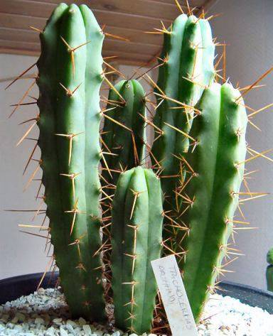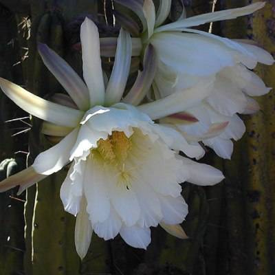 Trichocereus bridgesii, also classified as Echinopsis lageniformis, is a bluish-green columnar cactus native to Boliva, which is also where these seeds are from. It resembles the more common San Pedro cactus, Trichocereus pachanoi but typically has fewer, wider ribs and longer spines. In fact, many references to San Pedro in Bolivia are believed to actually be referring to Trichocereus bridgesii rather than Trichocereus pachanoi, both of which contain the psychoactive alkaloid mescaline. This cactus has gained much popularity among cactus collectors in recent years. Like Trichocereus pachanoi, it has huge, white blooms that make it an attractive landscaping cactus. It grows a little bit slower than Trichocereus pachanoi but is still a rapid grower, making it one of several Trichocereus species that work well as a grafting stock for slower-growing cacti such as Astrophytum, Peyote and Ariocarpus. It can reach 4.5 meters in height and tends to produce offsets rather easily. Trichocereus bridgesii is also easy to grow from seed, but its seedlings You're buying a pack of 10 Seeds We'll supply you with all the germination & care instructions.