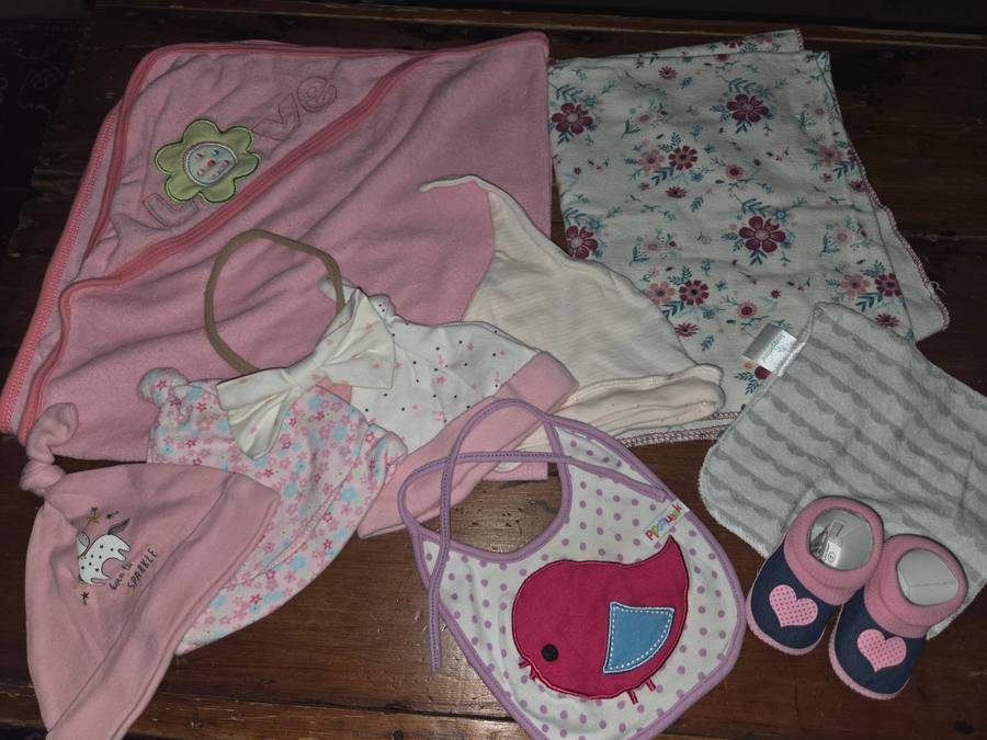 10 x Baby Girl items - Incl. Bibs, towel, blanket, shoes, etc.