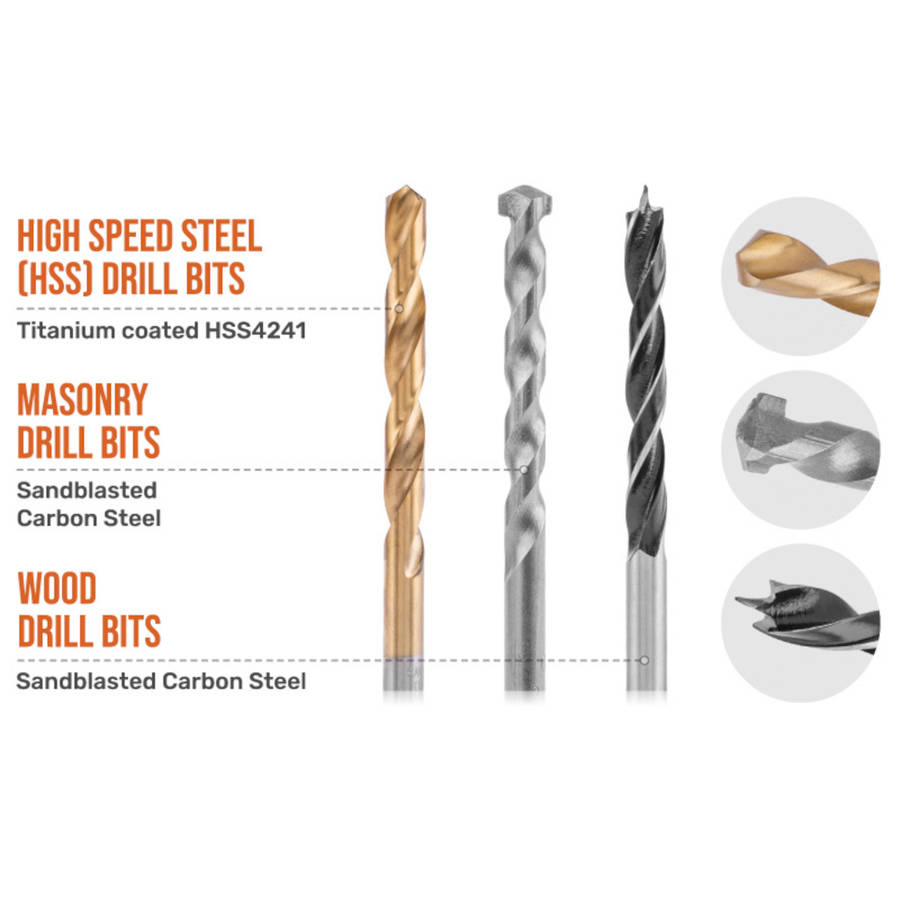 | 130 Pcs | 6 6mm Masonry drill bit 6 5mm Masonry drill bit 12 4mm Masonry drill bit 1 8mm Masonry drill bit 1 10mm Masonry drill bit 66mm Woodworking drill 65mm Woodworking drill 124mm Woodworking drill 18mm Woodworking drill 110mm Woodworking drill 66mm High speed steel twist drill 65mm High speed steel twist drill 124mm High speed steel twist drill 123mm High speed steel twist drill 202mm High speed steel twist drill 201mm High speed steel twist drill 18mm High speed steel twist drill 110mm High speed steel twist drill 1 Storage Box |