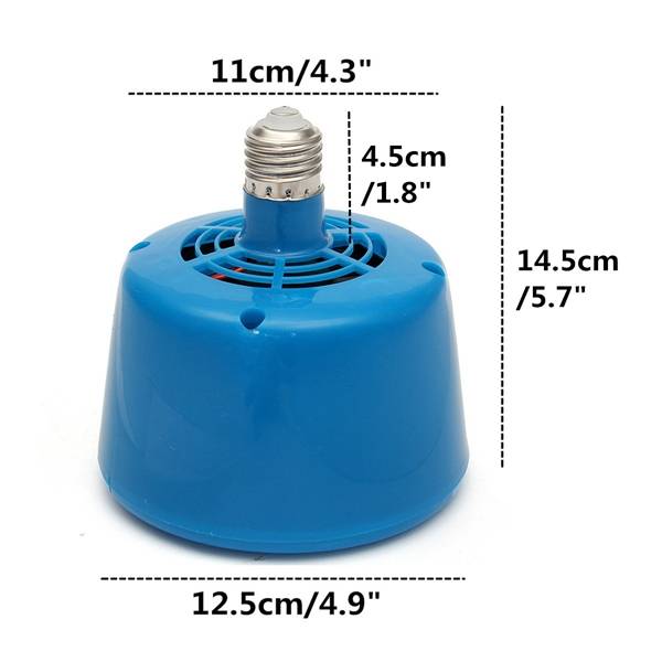 - Sterilization, disinfection, promote pet blood circulation and help digestion, environmental protection and energy saving, water-proof, longest life expectancy up to 15,000 hours. Specification: Color: Blue Material: Plastic, Aluminum Power: 100-300W Voltage: 220V Base: E27 Size:Diameter: 12.5 cm / 4.9" Height: 14.5 cm / 5.7" Applicable area: 1 squre meter Used for: Chicken, duck/piglet young livestock and poultry keeping warm Packing Included: 1 x 100-300W Cultivation Heating Lamp