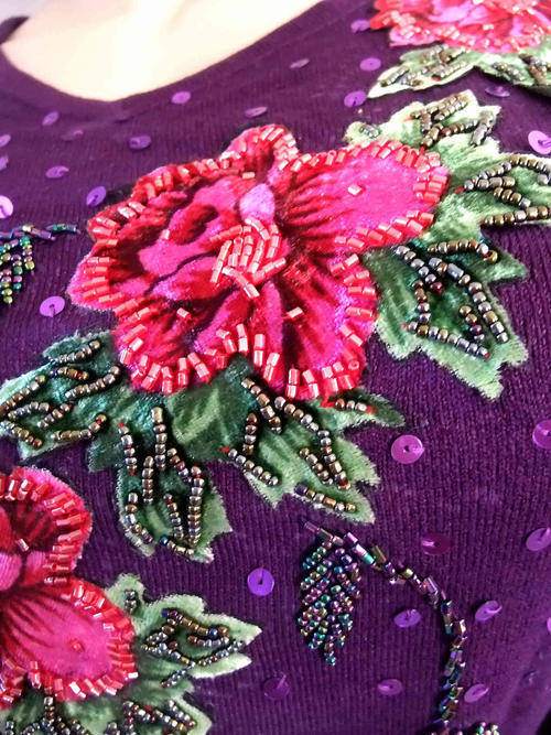 100% Cotton V Neck Knit Top With Floral Sequins Dark Purple