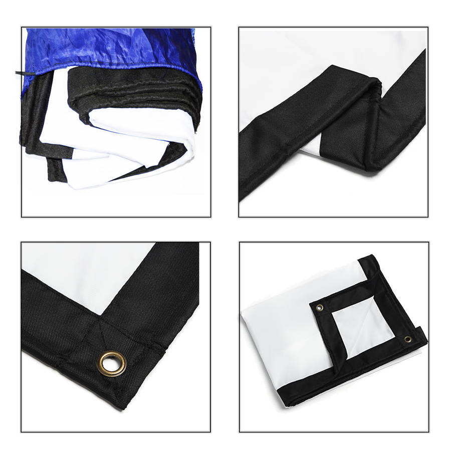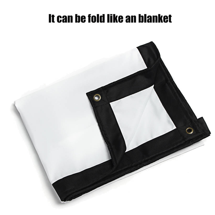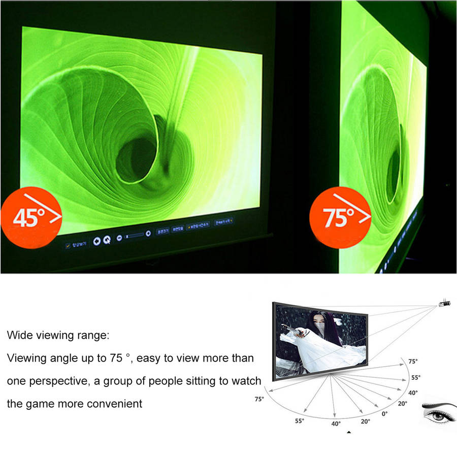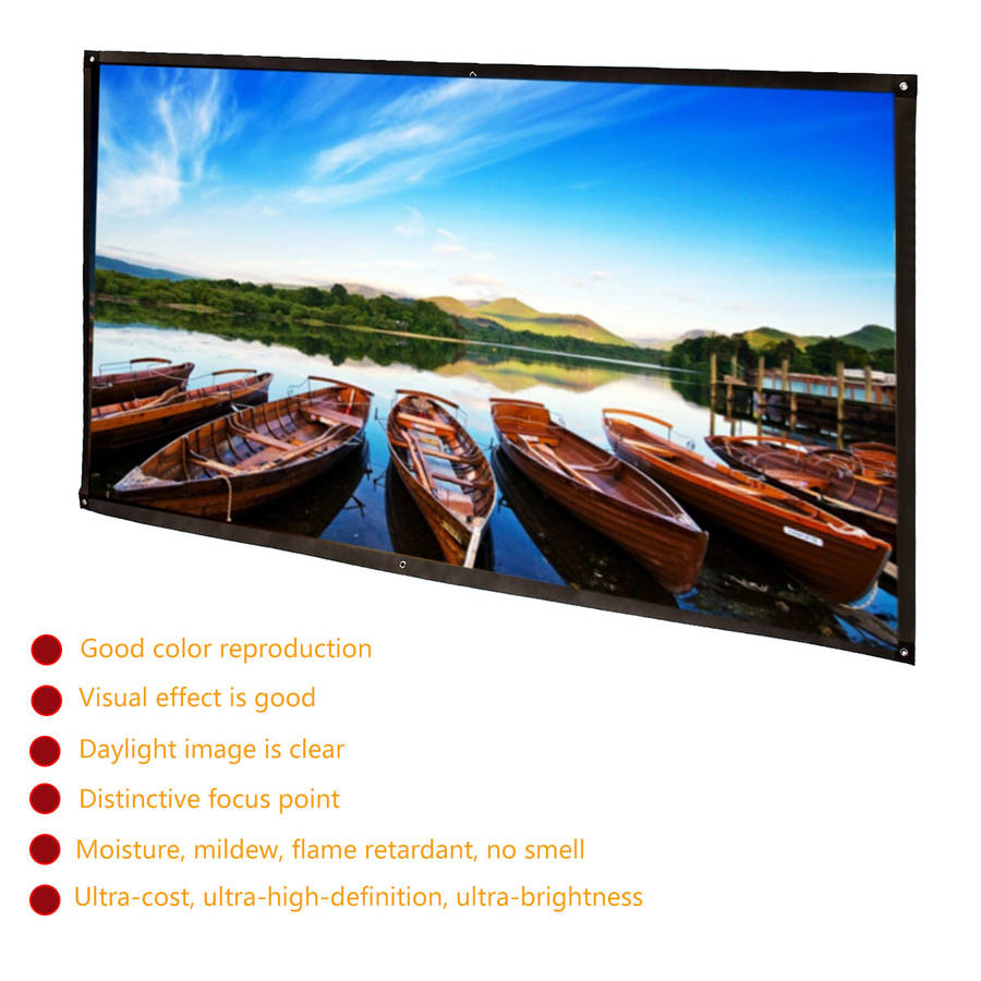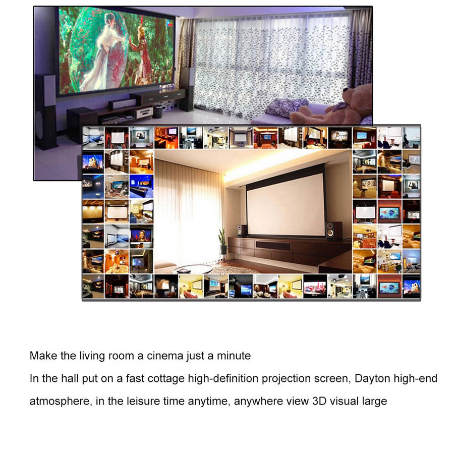 Features: -Visual effect is good. -Daylight image is clear. -Distinctive focus point. -Good color reproduction. -Projection Screen ,easy to carry and bring. -Moisture, mildew, flame retardant, no smell. -Ultra-cost, ultra-high-definition, ultra-brightness. -Easy installation and disassembly make it more comfortable. -Matte white viewing surface diffuses projected light uniformly. -Lightweight and compact one-piece design, perfect for handheld projectors. -Enjoy your own movie ,every time you want watching a movie , you will enjoy it. -Lightweight and compact one-piece design, perfect for handheld projectors. -Innovative optical coating flat screen,so that the curtain to adjust the degree of light reflection. -It is an ideal choice for home theater movies, classroom training, conference room presentations, public display, etc. - Wide viewing range:Viewing angle up to 75 ᆪ, easy to view more than one perspective, a group of people sitting to watch the game more convenient. - Make the living room a cinema just a minute, in the hall put on a fast cottage high-definition projection screen, Dayton high-end atmosphere, in the leisure time anytime, anywhere view 3D visual large.