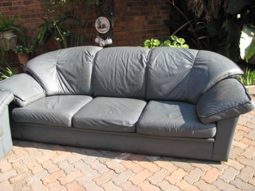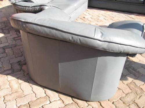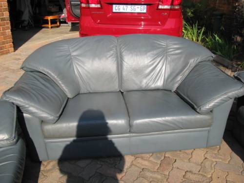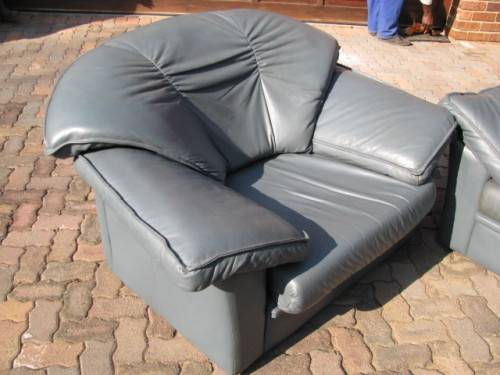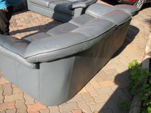 A LOVELY 100% LEATHER LOUNGE SUITE IN A BLUE GREY COLOUR. CONSISTS OF A 3 SEATER, A 2 SEATER AND A SINGLE SEATER.
