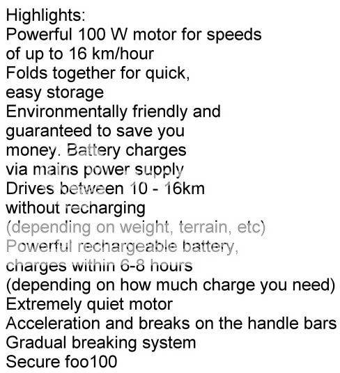 The electric motor is quick and easy to charge with no fumes, no noise, and no visits to the gas station, which means you save money and the environment at the same time!