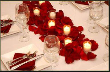 PETALS IN WATER IN VASES TOPPED WITH A FLOATING CANDLE MAKE INEXPENSIVE CENTREPIECES