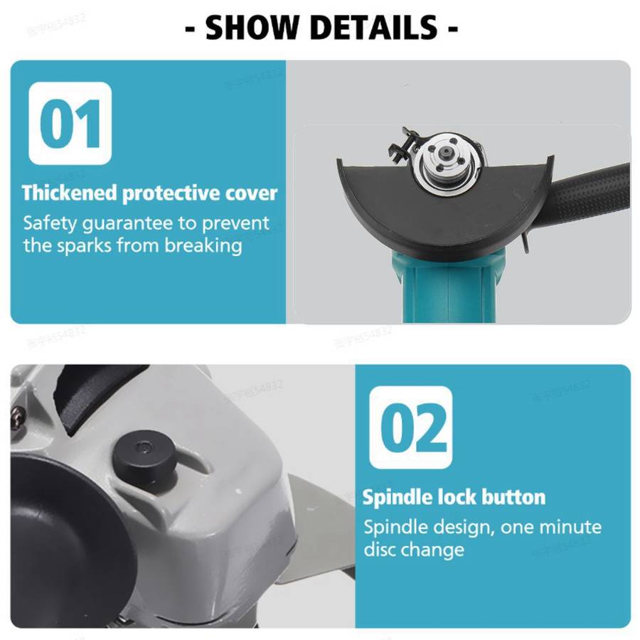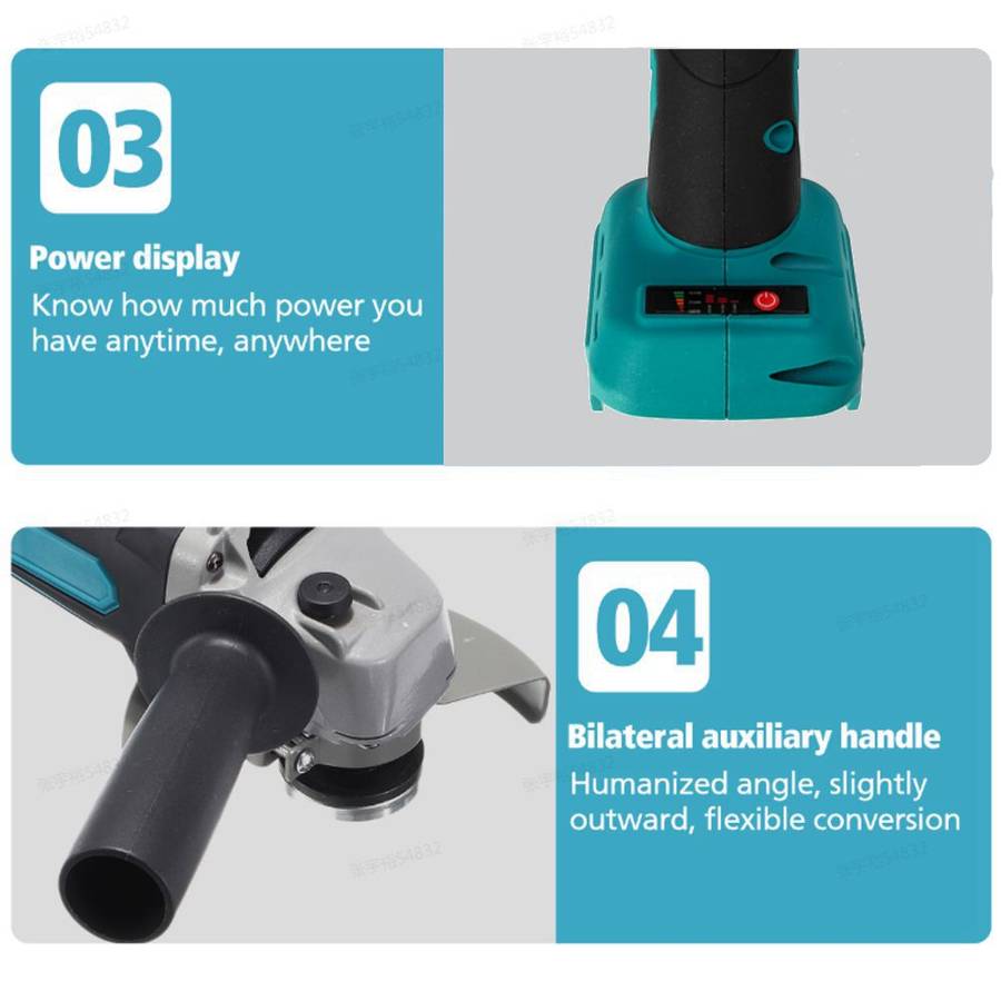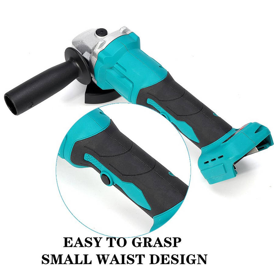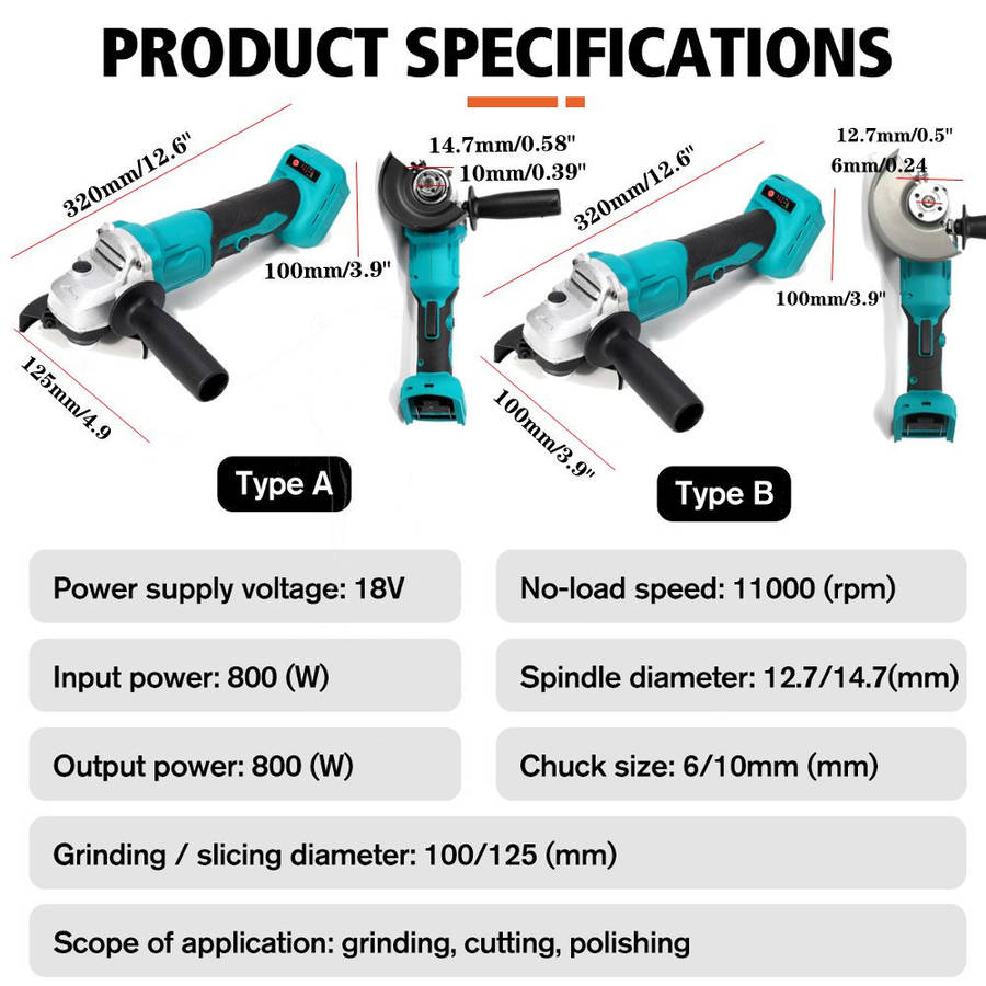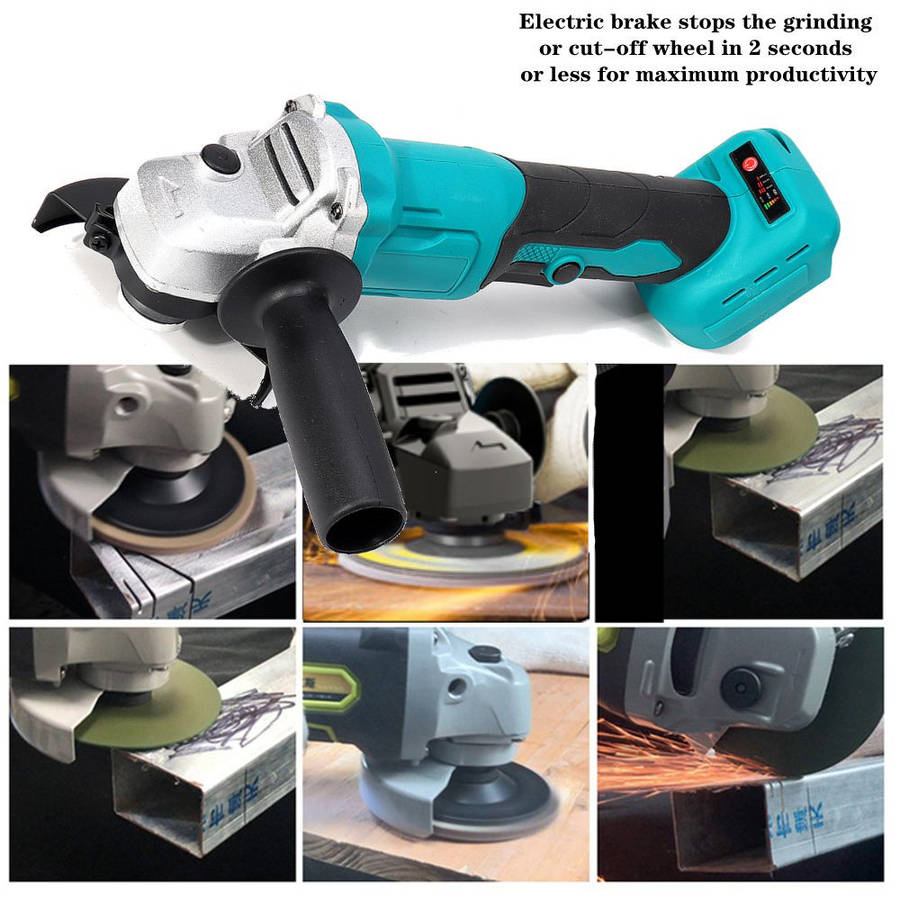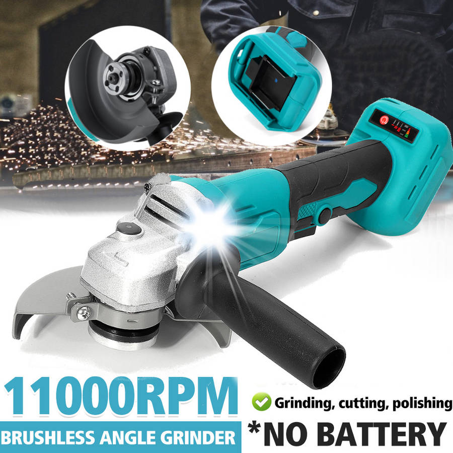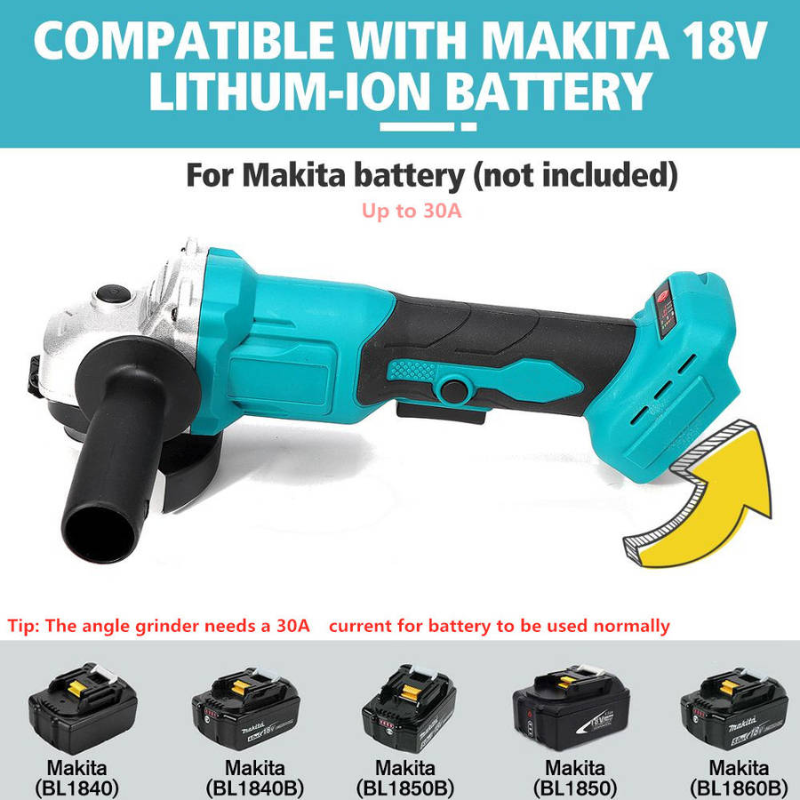 For Makita battery (not included)E.g: Makita(BL1840)MakitaBL1840BMakitaBL1850BMakitaBL1850MakitaBL1860Betc . Features: 1. Brushless Motor: Delivers Up to 57 Percent More Run Time over Brushed 2. No Load Speed: Max 11000RPMs 3. Blade brake: brake engaged when paddle switch is released, bringing the wheel quickly to a stop 4. Maximum initial battery voltage (measured without a workload) is 20 volts. Nominal voltage is 18. Specifications: Power supply type: Rechargeable-lithium technology Grinding / slicing diameter:100 mm/125 mm Power supply voltage: 18V Output power: 850 (W) Output power: 850 (W) No-load speed: 11000 (rpm) Spindle diameter: 14 (mm) Chuck size: 6mm (mm) Package included: 1 * Brushless Angle Grinder 1 * Bezel 1 * Handle 1 * Wrench