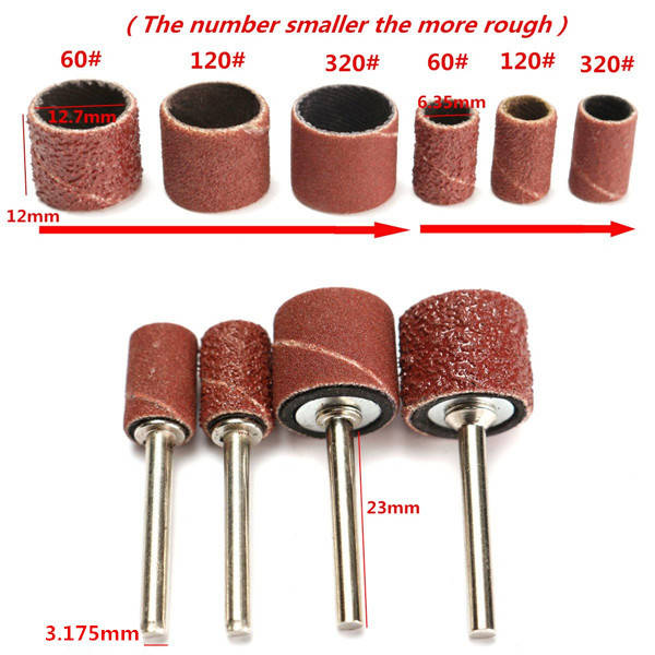 Description: 100pcs 60/120/320 Grit Drum Sanding Kit Fit Dremel Rotary Tools with 1/2 and 1/4 Inch Sanding Mandrels ?