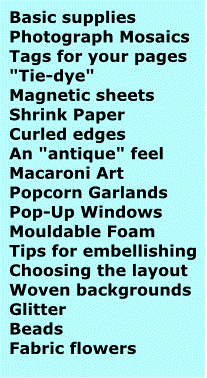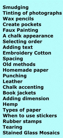Adding puzzle pieces to your pages What you can do to fix mistakes... Using glass marbles to create a unique magnifying effect Two unique substitutes for ribbon and lace Questions to ask yourself when selecting a theme Weaving photographs Find out which markers are best for your project and won't bleed. The importance of a colour scheme Photographs chemicals and what to do Keep your scrapbook from aging Add feather the right way Correctly add dried flowers Create embossed foil Painted tissue paper Accents with acrylic paints Highlight with Dry-brushing Rusted metal appearance Protect your scrapbook Find graphics for for free Vellum to create shadows