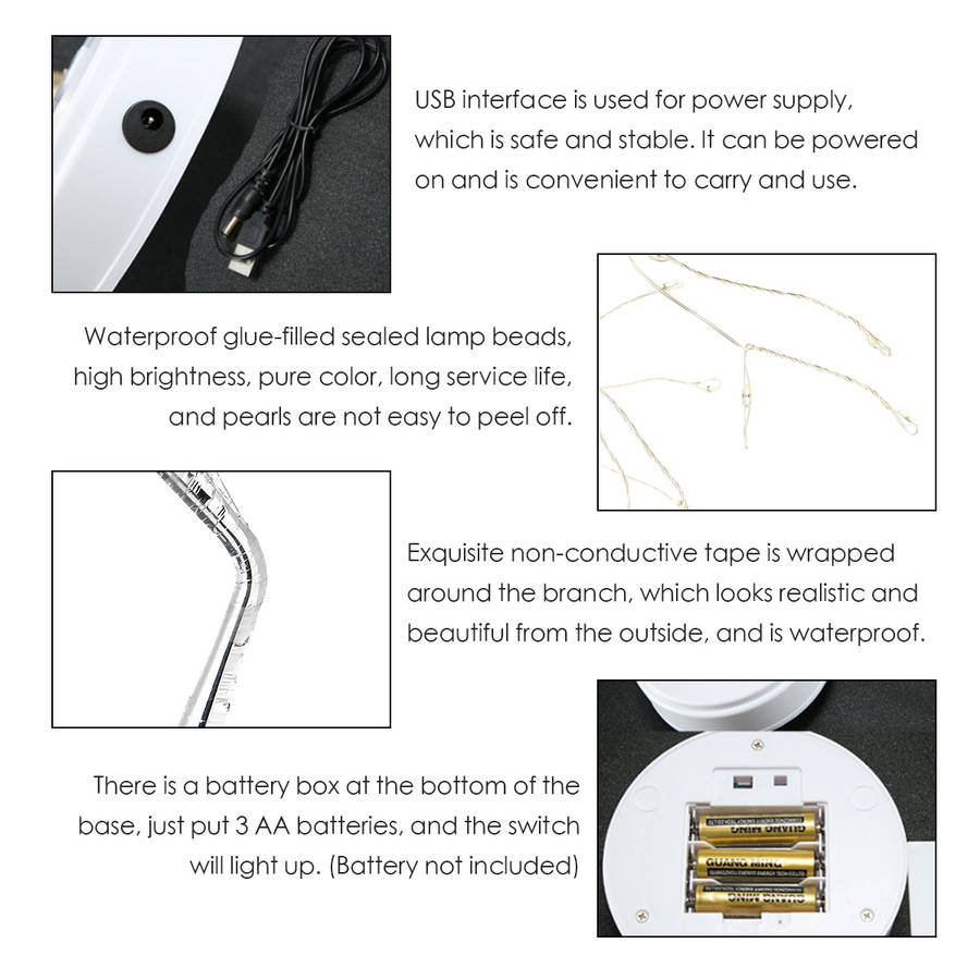Features: a The USB interface is used for power supply, which is safe and stable. It can be powered on and is convenient to carry and use. a Waterproof glue-filled sealed lamp beads, high brightness, pure color, long service life, and pearls are not easy to peel off. a The exquisite non-conductive tape is wound on the branch with the exquisite non-conductive tape. From the appearance, it is realistic and beautiful. The inner appearance is waterproof, non-conductive and safe! a Exquisite non-conductive tape is wrapped around the branch, which looks realistic and beautiful from the outside, and is waterproof, non-conductive and safe from the inside! a There is a battery box at the bottom of the base, just put 3 AA batteries, and the switch will light up. (Battery not included)