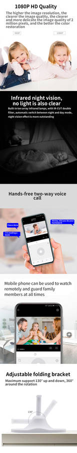 1 x 1080P 2MP Wireless Camera 1 x Packing 1 x Plug 1 x Power line 1 x manual 1 x Screw + bracket + card + adhesive paper