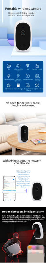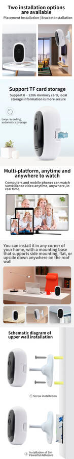 1. Hibernate and stand by by by default. When the dynamic object enters the monitoring area, it wakes up the camera immediately and pushes information to the mobile app. 2. Built-in ten array infrared lamps, with IR-CUT double filter, automatic switch between night and day mode, night vision effect is more outstanding. 3. Maximum support 130° up and down, 360° around the rotation. 4. Two installation options are available: Placement Installation or Bracket Installation. 5. Support 8 ~ 128G memory card, local storage information is more secure. 6. Loop recording, automatic coverage. 7. Computers and mobile phones can watch surveillance video anytime, anywhere, in real time.