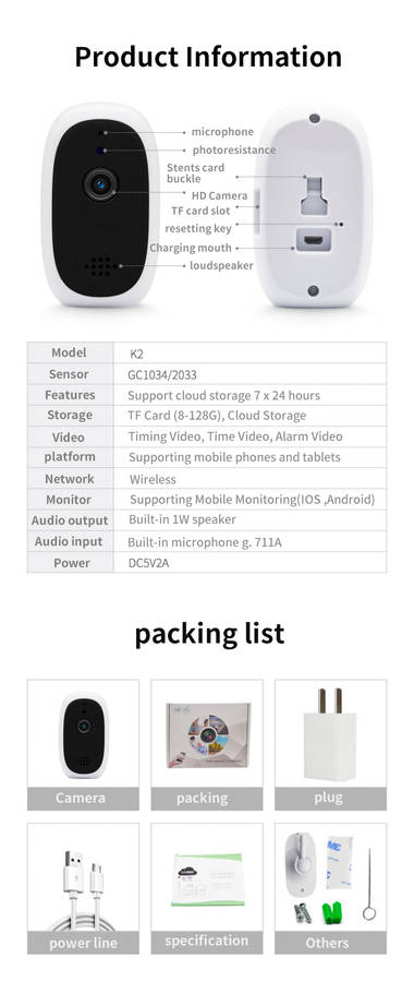Model: k2 Sensor: GC1034 / 2033 Features: Support cloud storage 7 x 24 hours Storage: TF Card(8-128G),Cloud Storage Video: Timing Video, Time Video, Alarm Video Platform: Supporting mobile phones and tablets Network: Wireless Monitor: Supporting mobile monitoring(IOS, Android) Audio Output: Built-in microphone Power: DC 5V/ 2A