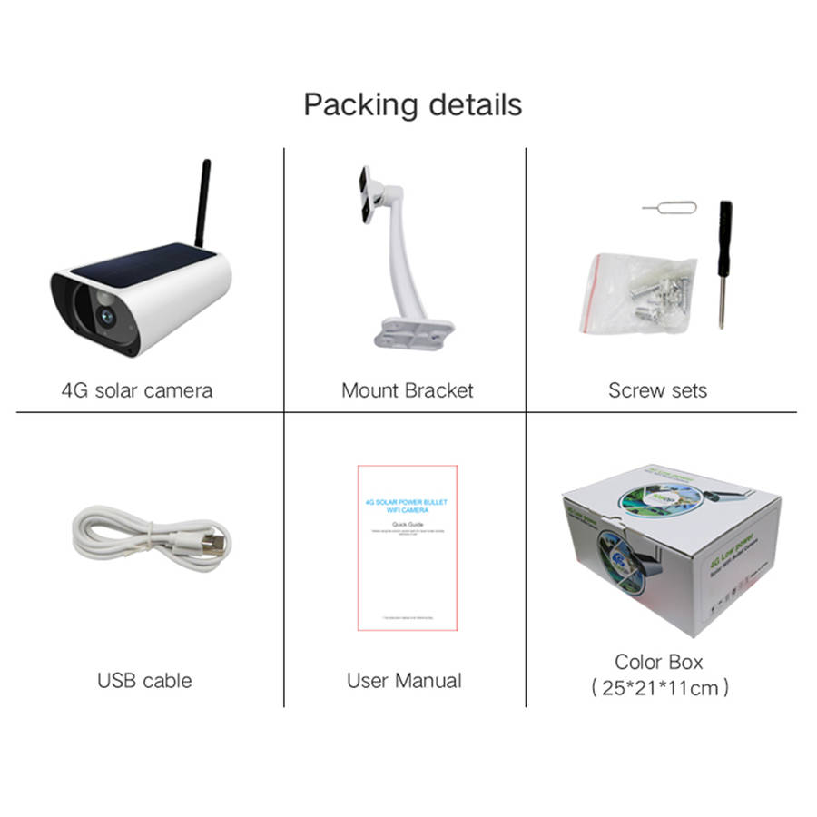 Package Included: 1x 4G Solar Security Camera 1x Mount Bracket 2x Battery 1x USB cable 1x Screw sets 1x User Manual