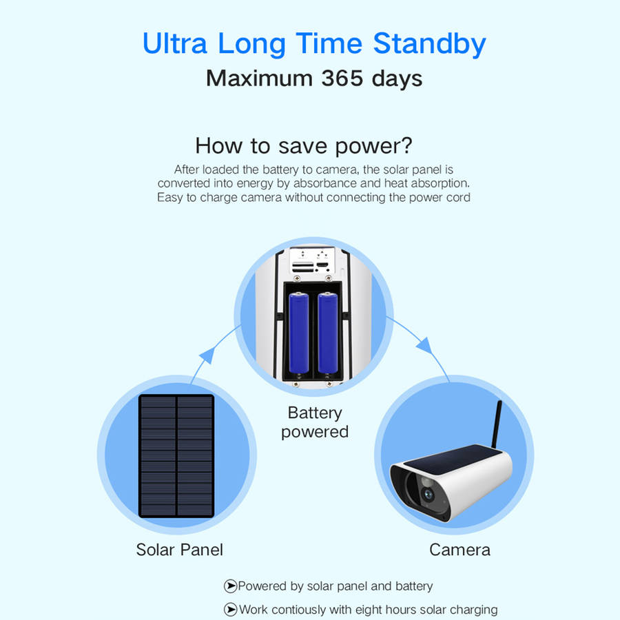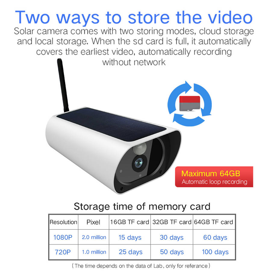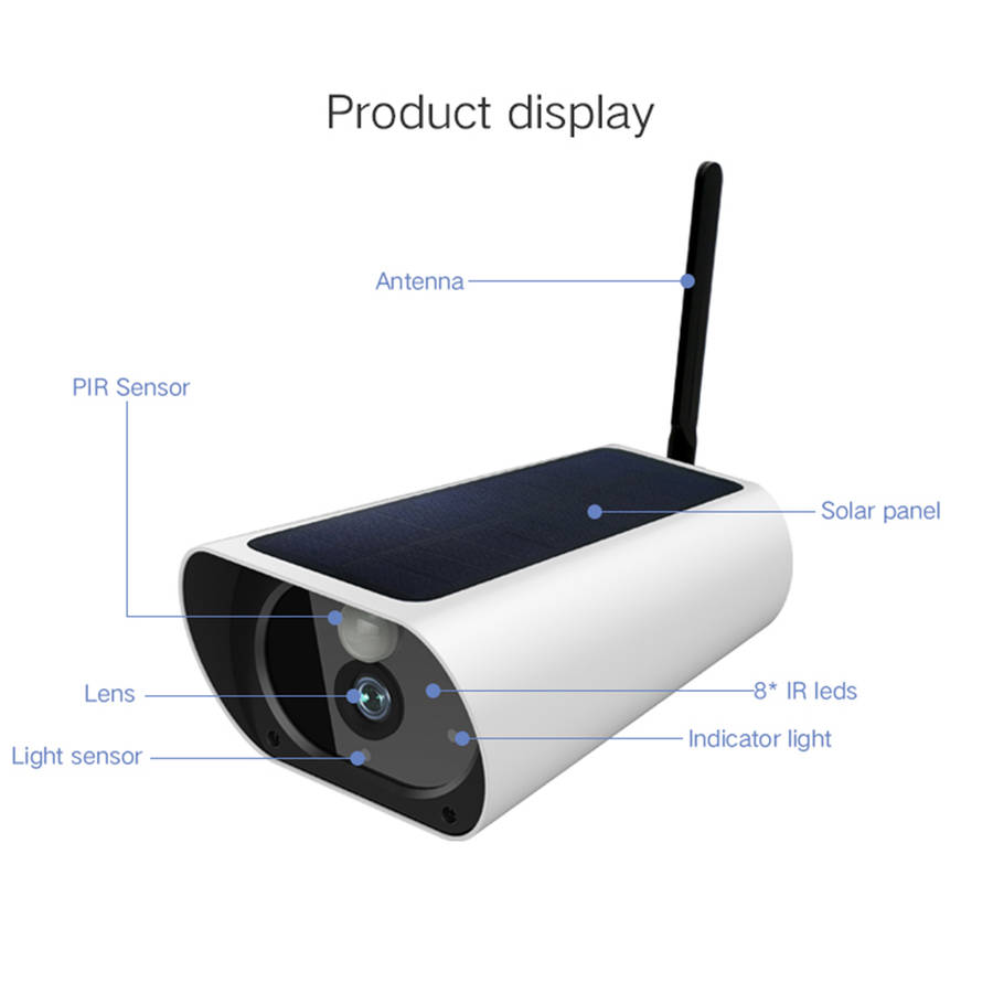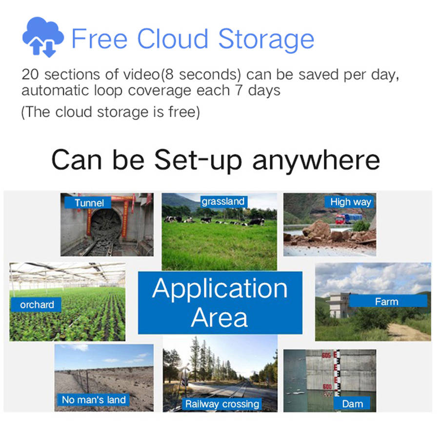Specification: 1.MainChipset: Hi3518EV200 2.Sensor: HD COMS sensor 1/2.7 PS5230 3.Lens: 2G2P FULL Super-angle Lens 4.Angle: Horizontal 92 Degree 5.Video Stream: 1920*1080/15fps 6.CMOS: Support auto Whitelight Balance, Auto-Enhanced Control, Auto Blacklight Compensation 7.System: Lite OS 8.Standby Time: Lighting for 4 hours Under the Sun, last for one day 9.Day&Night Switch: Dual-filters auto-switch 10.IR Distance: 850nm, Effective Distance 10-15m 11.Internet Match: QR Code 12.M otion Detection: PIR Detection 13.Audio: Coding: AAC&G.726 I/O: -38dB Mic /Inside 1"Speaker 14.Recording Manage: Recording Methods: Manual /Alarm Recording 15.Internet: 4G: LTE Protocols: FDD-LTE, TDD-LTE, TD- SCDMA, HSPA+, HSDPA, UMTS, EVDO, EDGE, GPRS, GSM, CDMA1x Wireless: LTE Wireless Communication Module 16.Alarm: PIR Detection: Yes 17.Functions: Auto-adaptation:Yes Two-way Speak: Real-time talk Panoramic Show: Analog 3D & Auto C ruise Standby Time: 15S, 30S,60S, option Voice call: Yes Remote waking: Yes Motion Waking: PIR APP: i-CAM, ios10.0, androids 5.0 above 18.Others: Power: Solar Panel+USB Power Tem.: -10"C~+50°C Hum: ≤80%RH