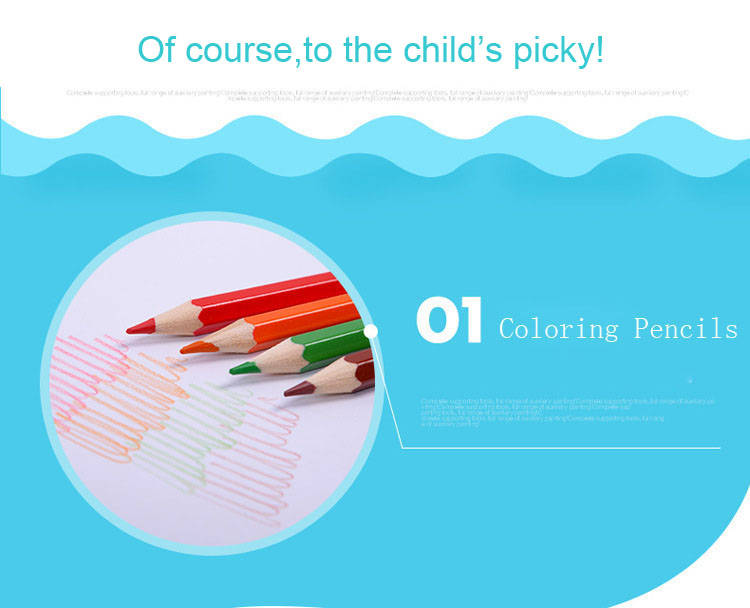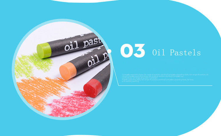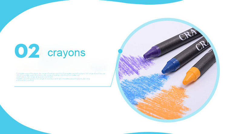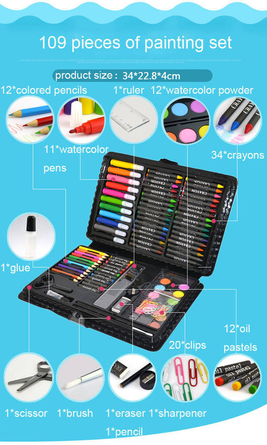 12 x colored pencils 11 x watercolor pens 12 x watercolor powder 34 x crayons 12 x oil pastels 20 x clips 1 x ruler 1 x glue 1 x scissor 1 x brush 1 x eraser 1 x pencil 1 x sharpener 1 x storage box 1 x palette
