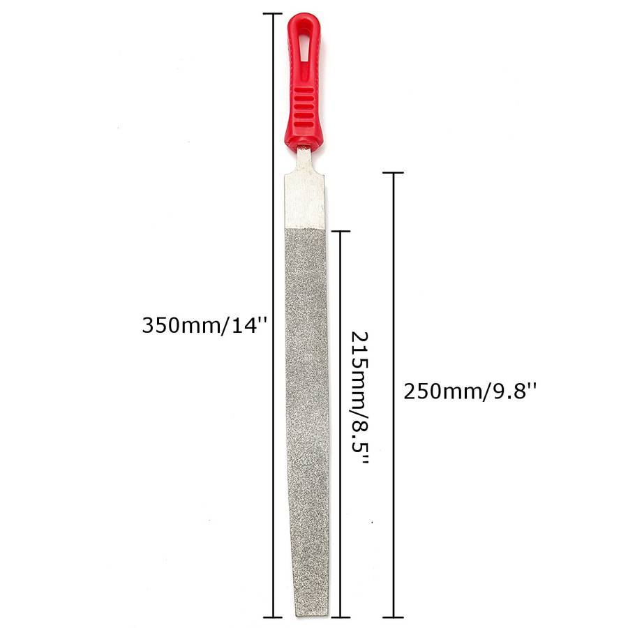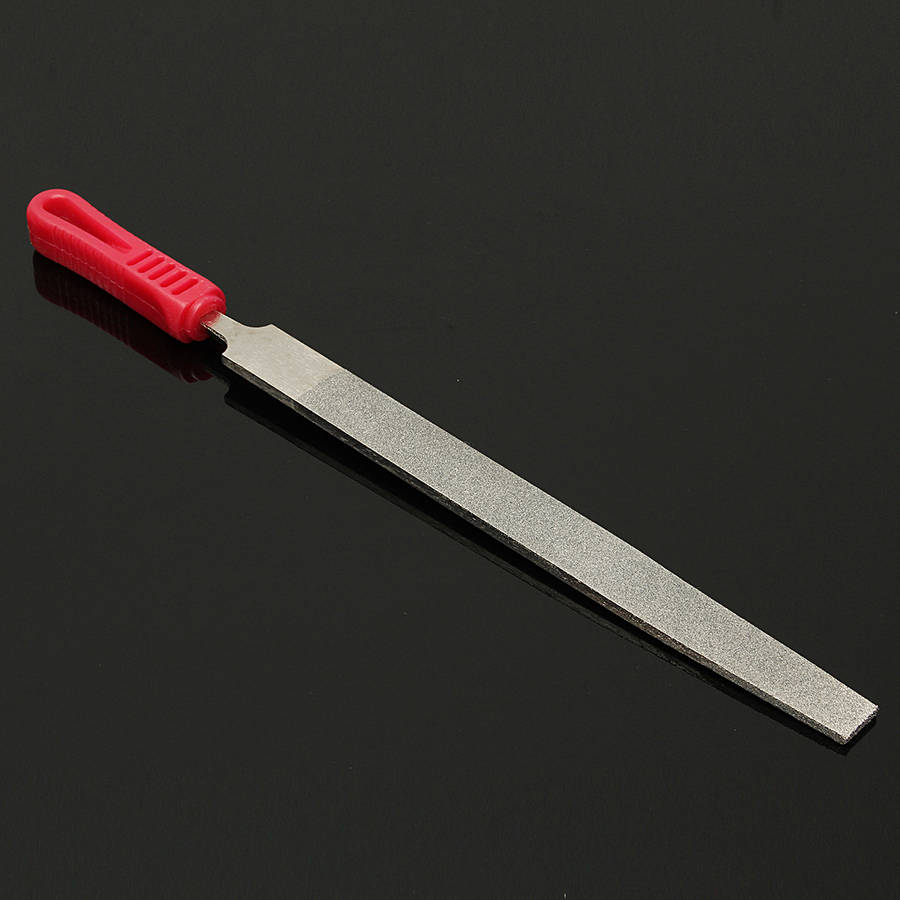 Package weight: 0.26 kg Description: 10Inch 120 Grit Diamond Files Metal Glass Stone Shaping Knife Tool Specification: Material: Alloy Color: Red+Silver Coarseness: Middle Cut Grit: 120 (coated both sides) Working area : 25mm x 215mm/1'' x 8.5'' Total Length: 350mm/14'' (include the handle) Thickness: 5mm Features: Ideal for filing glass, ceramic, rock, carbide, gold, platinum, silver. Suitable for grinding on glass, stone, marble, rock, bone etc. Cut quickly and smoothly since the files cut on both the push and pull strokes Used in deburring, fixing chipped glass, mirror, tile, ceramics, many hobbies and professional applications. Package Included: 1×Diamond Files More Details: