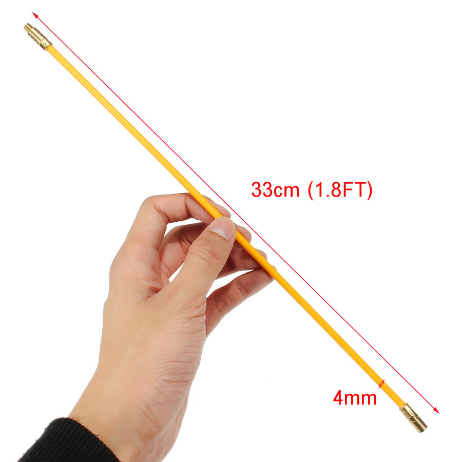 Description: These non-conductive fiberglass rods can be screwed together to form longer lengths for running wire through walls, attics, crawl spaces, sub-floors, and suspended ceilings. Specifications: Material: Fiberglass, brass Color: Yellow Length: 33cm (10.8FT) = 10pcs connect together Diameter: 4mm Plastic storage case size: 39cm x 3cm/15.4 x 1.2 Features: a For running wire through walls, attics, crawl spaces, sub-floors and suspended ceilings. a Great for installing cable. a Includes (1FT) 10 rods with threaded brass connectors, 4mm flexible acrylic connection, brass push and pull rods. a Rods connect for extension up to 10.8FT. a Comes with plastic storage case. a Fiberglass rod diameter is 3/16. Package Contents: 10 x Rods with threaded brass connectors 1 x Flexible acrylic connection 1 x Brass hook end for pulling 1 x Brass eye end for pushing