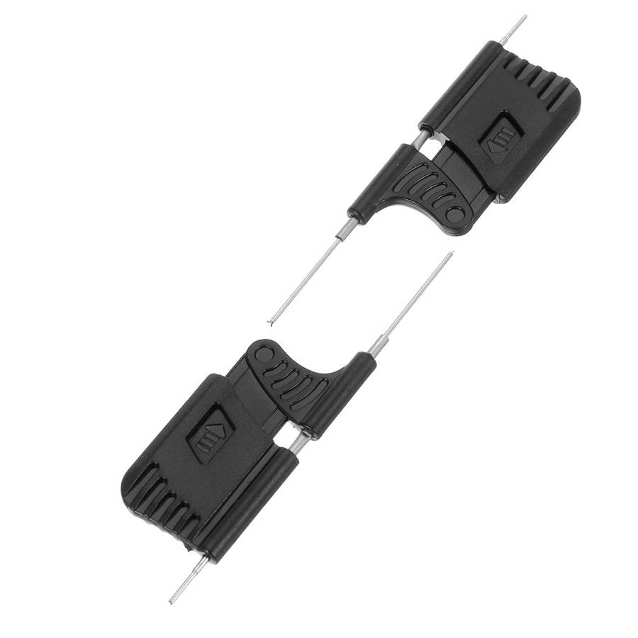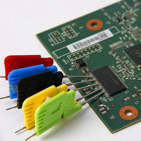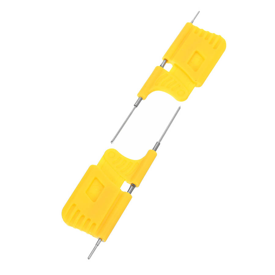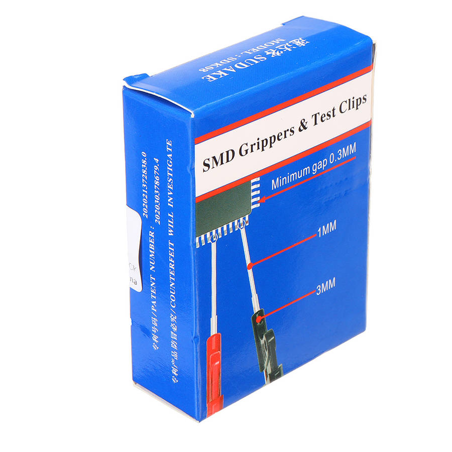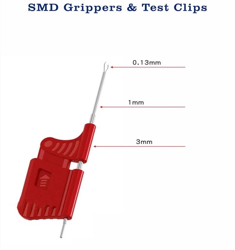 How to use: STEP1Insert the dupont line. STEP2Push out the clip . Operating skills: 1: SKD08 test clips are used for chips with spacing greater than 0.3mm. The method of holding small chip pin: Wobble the hand gently and push froard slightly. 2: After use, don`t force the clip off from the chip pin. To push out the clip and gently remove it from the chip pin. 3: If it can`t hold the chip pin, please refer to the picture:Adjust the front end of the clip with tweezers to make the angle close to 90 degrees. Product parameter: Model: SDK08 Voltage: 40V Current: 2A Package included: 10 x Test Clip set