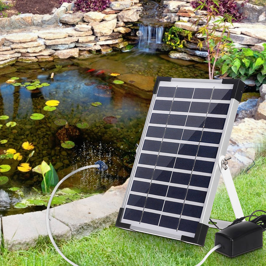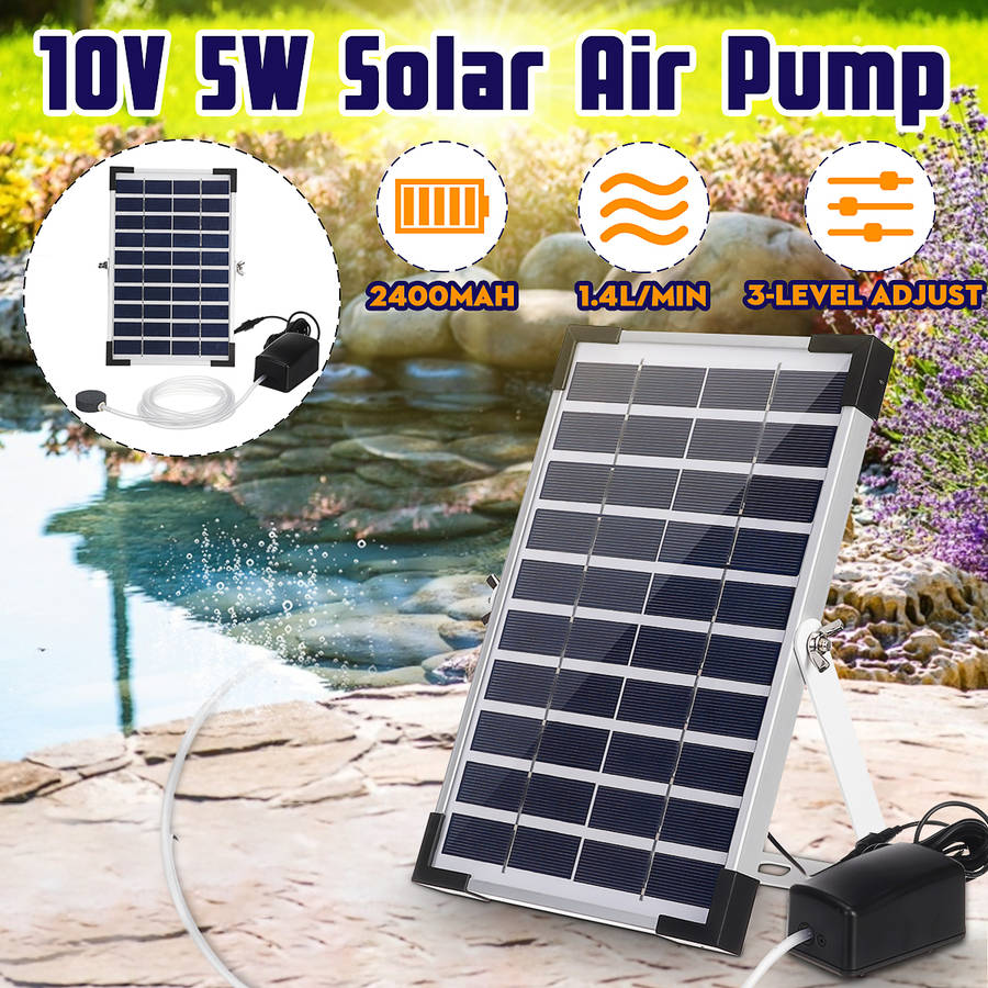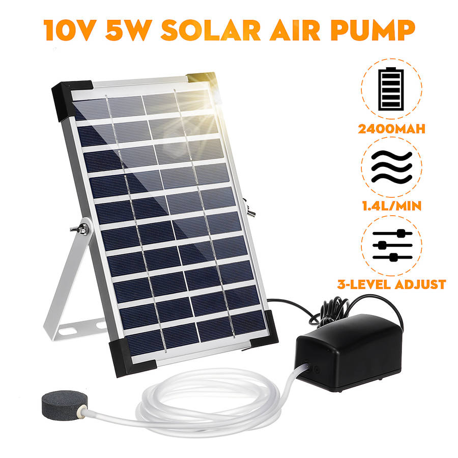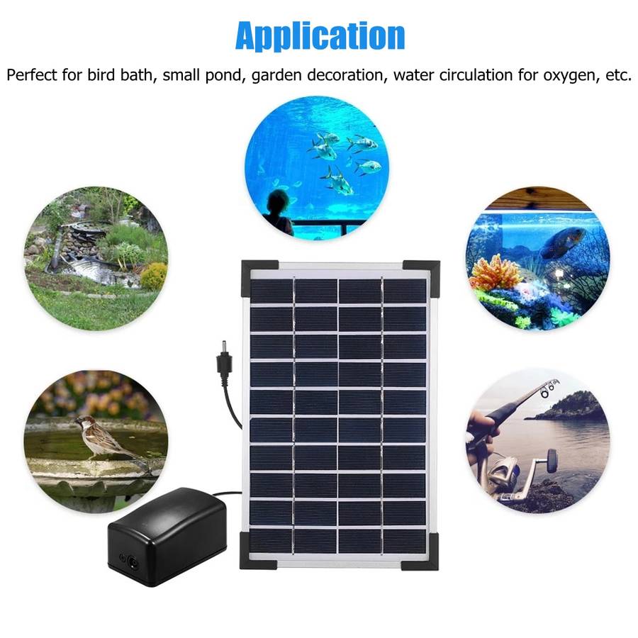 10V 5W Solar Panel Fish Tank Oxygenator Aquarium Oxygen Aerator Pond Air Pump Fishing Aquarium Airpump with Pipe & Bubble Stone Feature: [10V 5W Solar Panel] pump will auto-start under the sun, [2400mAh Li-ion Battery] for storing energy for night work. [2.6m hose, 2x bubble stones, 1x T-pipe], you can cut the hose to DIY a best oxygenator system! [Large Air Volume] stable 1.4L/min, suitable for 40-250L container. [3 working modes] High / Low / Alternation Mode to meet your different demands. [Low Noise] silent oxygen pump with less than 60 dB low noise [Adjustable Angle] to help receiving the sunlight most sufficiently. [Frame Protector] to protect the panel for a longer life-span. [Application] perfect for bird bath, small pond, garden decoration, water circulation for oxygen, etc.