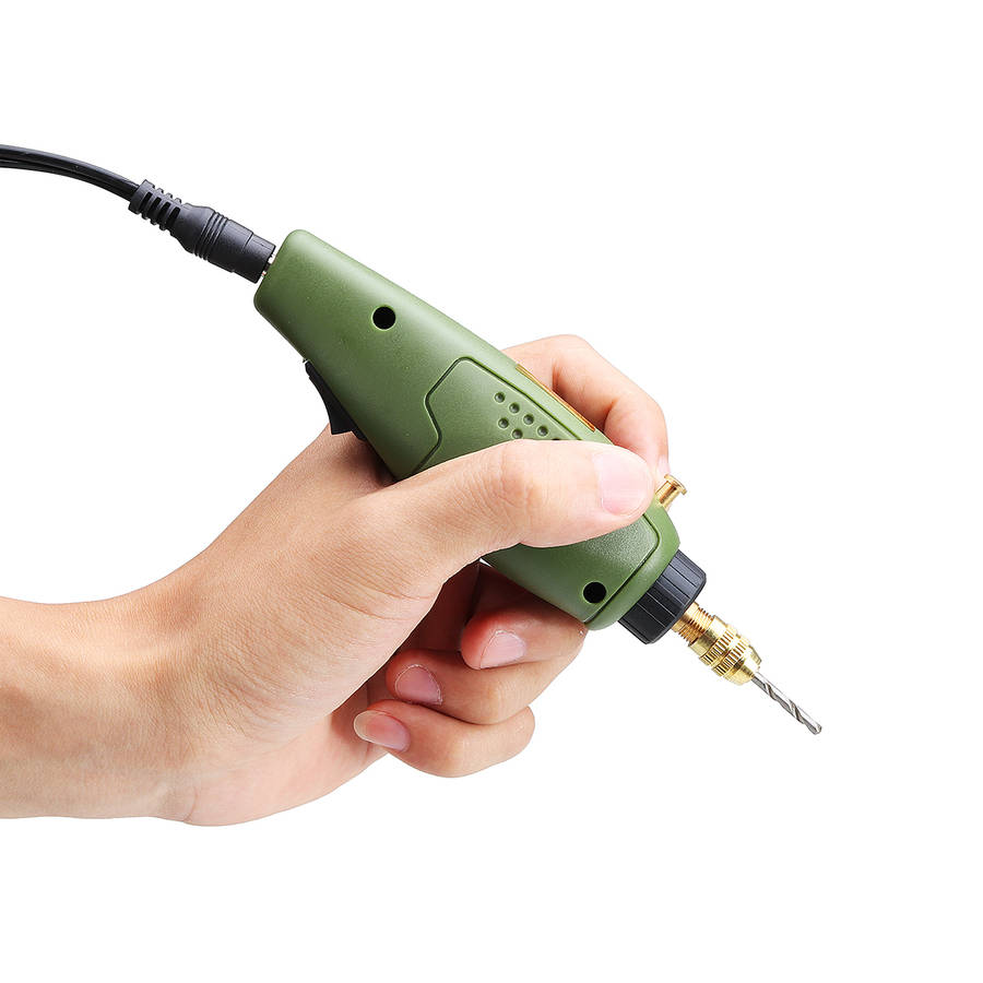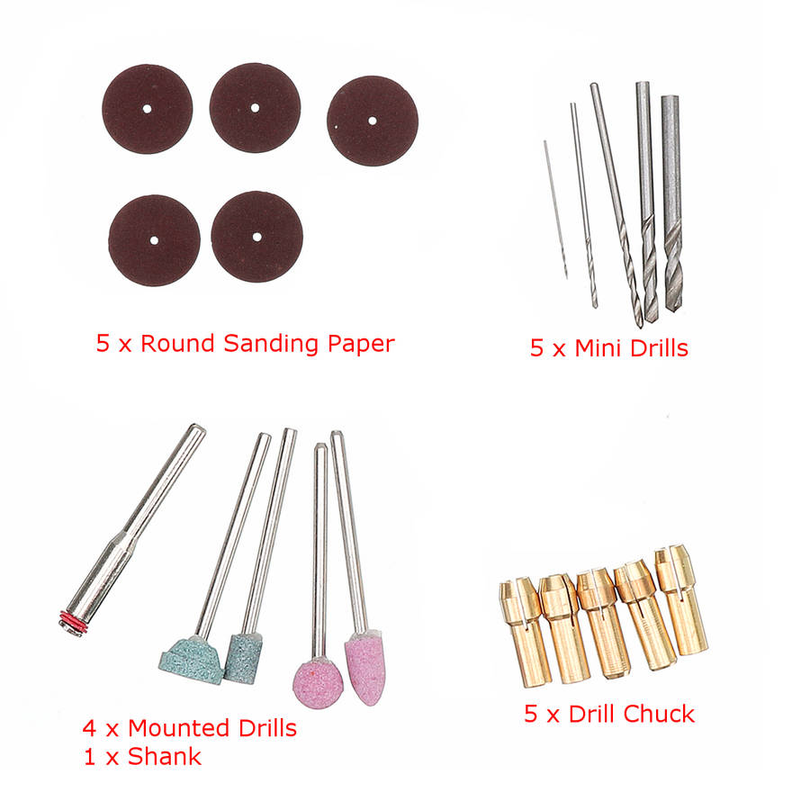 Package included: 1 x Electric Wood Carving 1 x Power adapter 5 x Drill Chuck 5 x Round Sanding Paper 5 x Mini Drills 4 x Mounted Drills 1 x Shank More details: