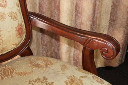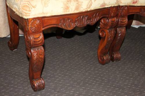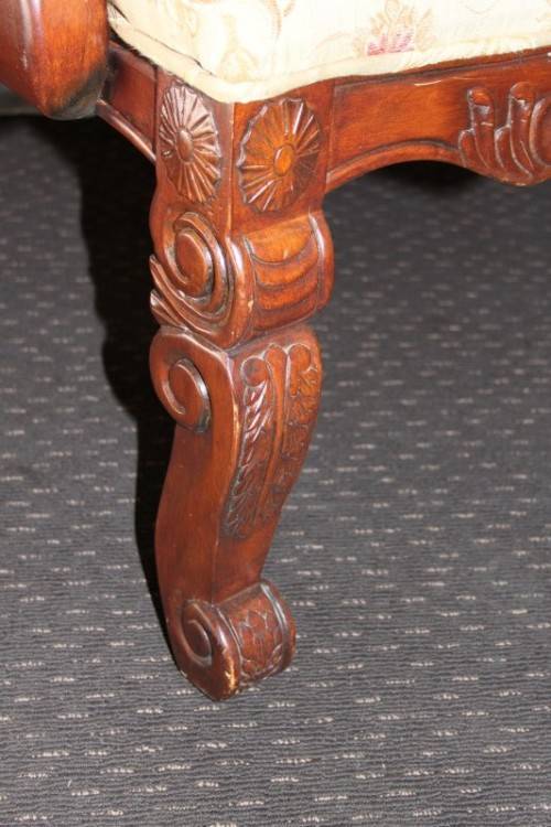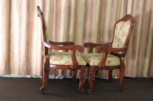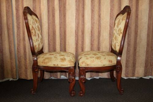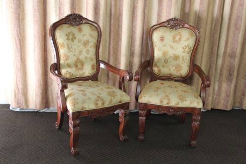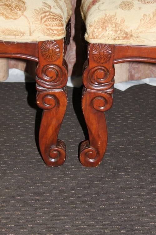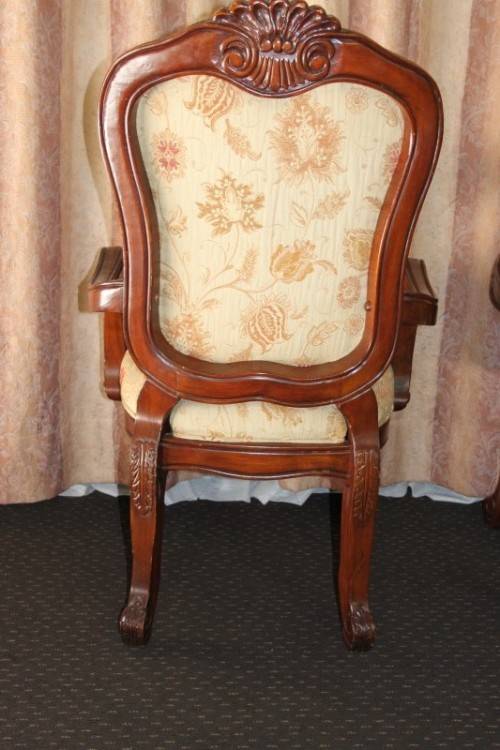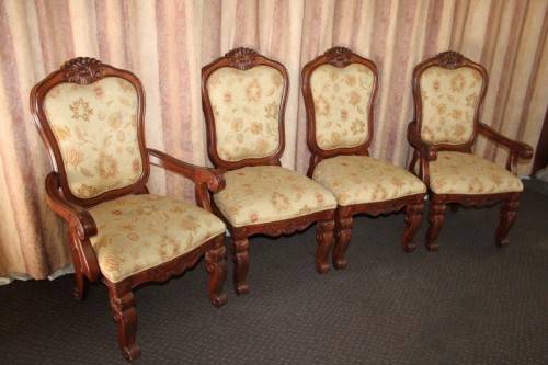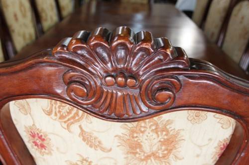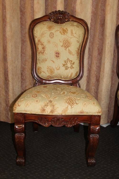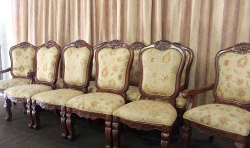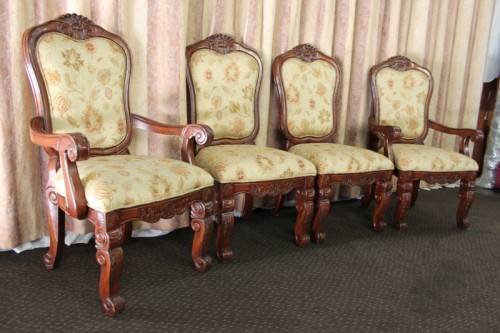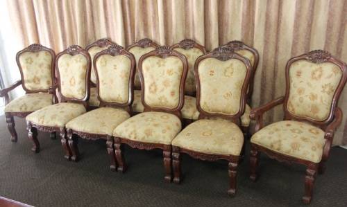 THESE MAGNIFICENT TOP QUALITY CARVED WALNUT DINING CHAIRS INCLUDE TWO CARVERS AND EIGHT DINING CHAIRS. THE INCREDIBLE CARVED DETAILING IS CARRIED FROM THE SCALLOPED BACKREST DOWN THE SIDES OF THE CHAIRS THROUGH TO THE INCREDIBLE BEAUTIFUL CHAIR LEGS. THE CHAIRS ARE SOLID AND HAVE STUNNING WEIGHT TO THE. THE CHAIRS ARE UPHOLSTERED IN A STUNNING EXPENSIVE FABRIC BUT COULD BE UPHOLSTERED TO SUIT YOUR DECOR. THE CARVERS ARE 680mm LONG x 600mm WIDE x 1145mm HIGH AND THE CHAIRS ARE 580mm LONG x 580mm WIDE x 1145mm HIGH. THERE IS NORMAL USAGE RELATED WEAR AND TEAR, BUT THEY ARE STILL SUPERB CHAIRS CRAFTED FOR THE MOST DISCERNING HOMES. THE UPHOLSTERY COULD DO WITH A GOOD CLEANING. PLEASE VIEW THE PICS CAREFULLY TO FULLY APPRECIATE THESE STUNNING UPMARKET DING CHAIRS AND TO CONFIRM THE CONDITION. THE LISTING IS FOR THE CHAIRS ONLY, THE TABLE CAN BE VIEWED IN THE PREVIOUS LISTING.