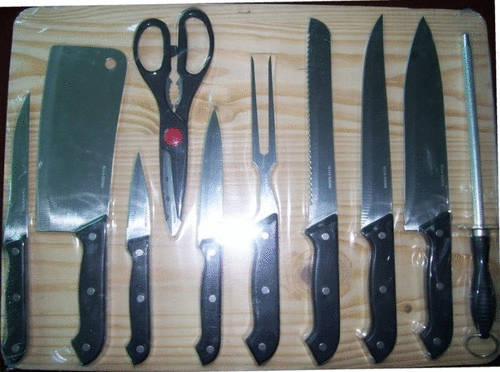 The sets consist of 1 PC bread knife, 1 PC chef's knife, 1 PC carving knife, 1 PC utility knife, 1 PC paring knife, 1 PC steak knife, 1 PC chopper, a pair of kitchen scissors, 1 PC meat fork, 1 PC sharpening steel and a piece of plastic wooden cutting board.