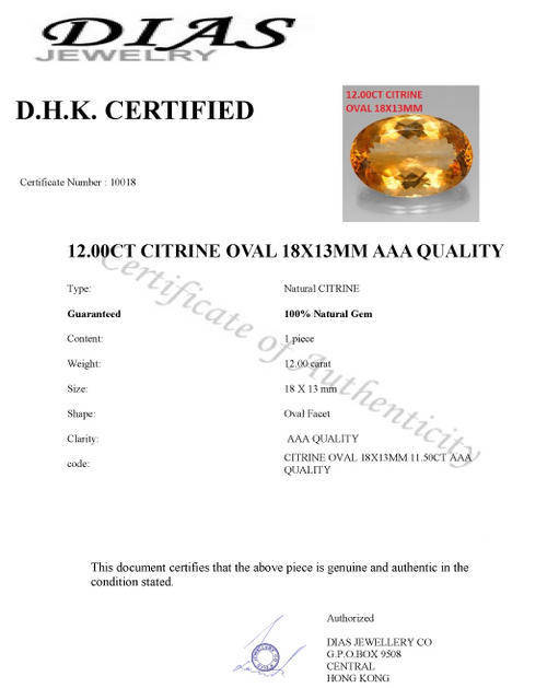 12.00CT CITRINE [D.H.K. CERTIFIED] OVAL 18X13MM AAA QUALITY Guaranteed 100% Natural