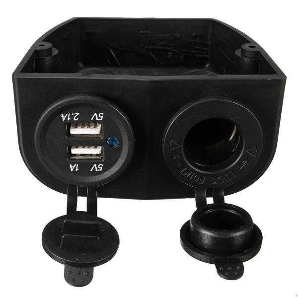 12/24V Cigarette Power Socket + USB Charger Power Adapter with 2 Screw ¿¿¿ 2 pole protected terminal connections. Short circuit / overheat protection. Multifunctional product, perfect for travel use. Waterproof dustproof material can be used for the interior and exterior application. Can be installed vertically, horizontally or underneath the dash, or any flat surface. Wiring kit for cigarette lighters to install in any 12V-24V motorbike, Boat, Riding mower, tractor or car. Widely used with electric equipment for power supply : Vehicle,GPS, mobile phone, camera, mp3 (cannot smoke) Optimised for iPad, iPhone & iPod - fast charging at full speed (2.1Amps for iPad, 1Amp for iPhone/iPod). Apply to all USB charging mobile phones or other electronic products. Run multiple accessories at one time, very convenient and easy to use. Allow any marine or automotive with a cigarette plug attachment to be used with these surface mount cigarette sockets. Easy to install - no need to cut out a big hole in the panel, these sit on the dash and fastened with 2 screws (supplied). Usage : Plug the Car Charger into the cigarette lighter and insert the connector of car charger adaptor into the PDA to realize recharging the PDA. Specification : Color : Black Input : 12V Output : 5V-2.1A Barrel inner diameter : 2.1cm/0.83" Barrel inner length : 3.6cm/1.42"