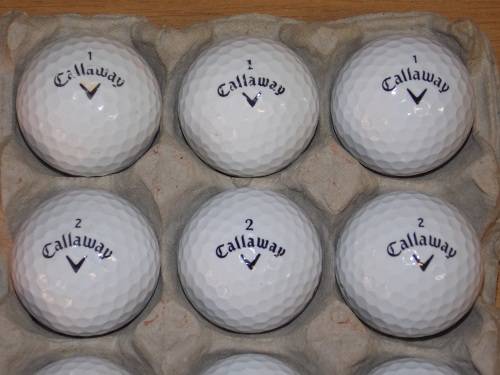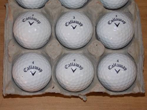 12 Callaway second hand golf balls. Numbered in black, 3 number 1's, 3 number 2's, 3 number 3's and 3 number 4's. The balls are in excellent condition, with almost no damage to the balls (as can bee seen on the pictures). The unique design of the Callaway golf ball is that it assists the amateur golfer with long drives and minimum spin on the fairway. It creates good spin on the short game allowing the ball break sharply on the green. Excellent buy.