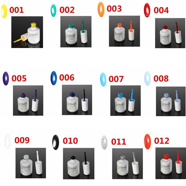 Package weight: 0.06 kg12 Colors 15ml Nail Art Soak Off UV Gel PolishDescription:UV Gel Size: App 7.5 (L) x 3.4 (D) cm