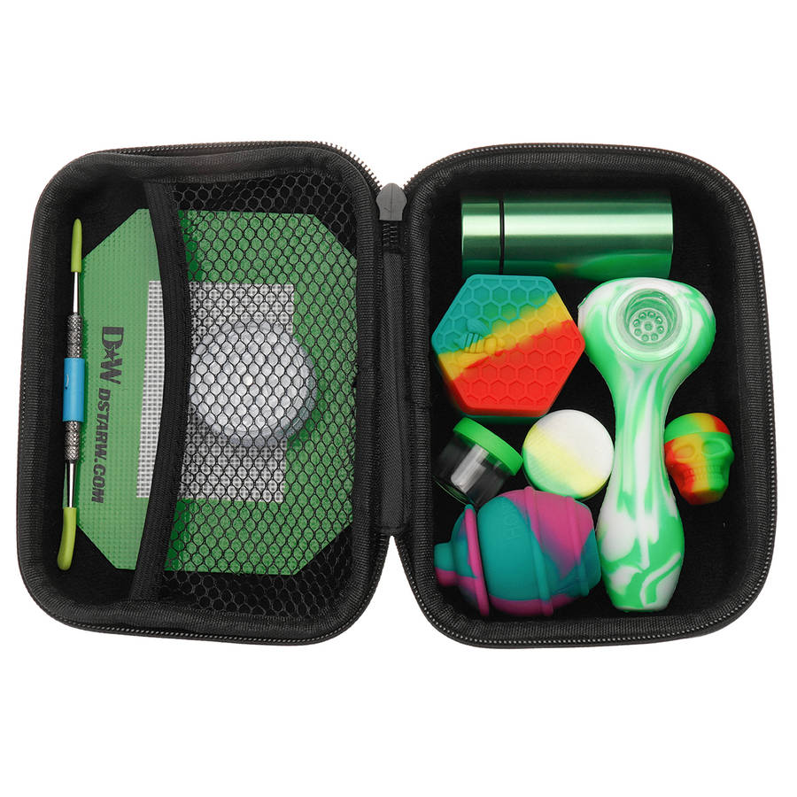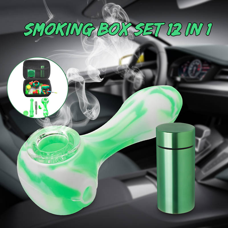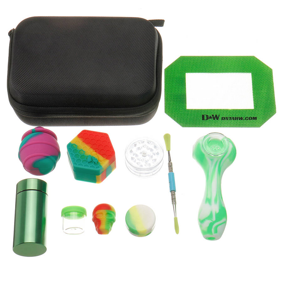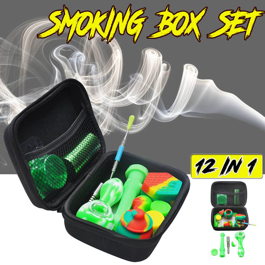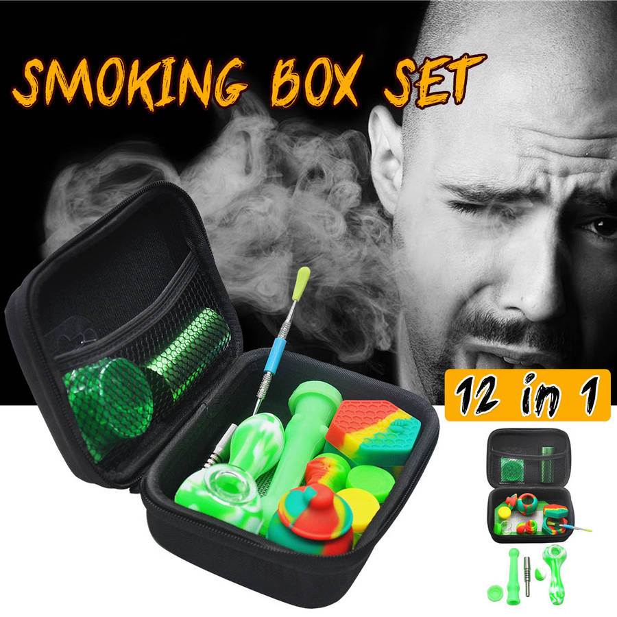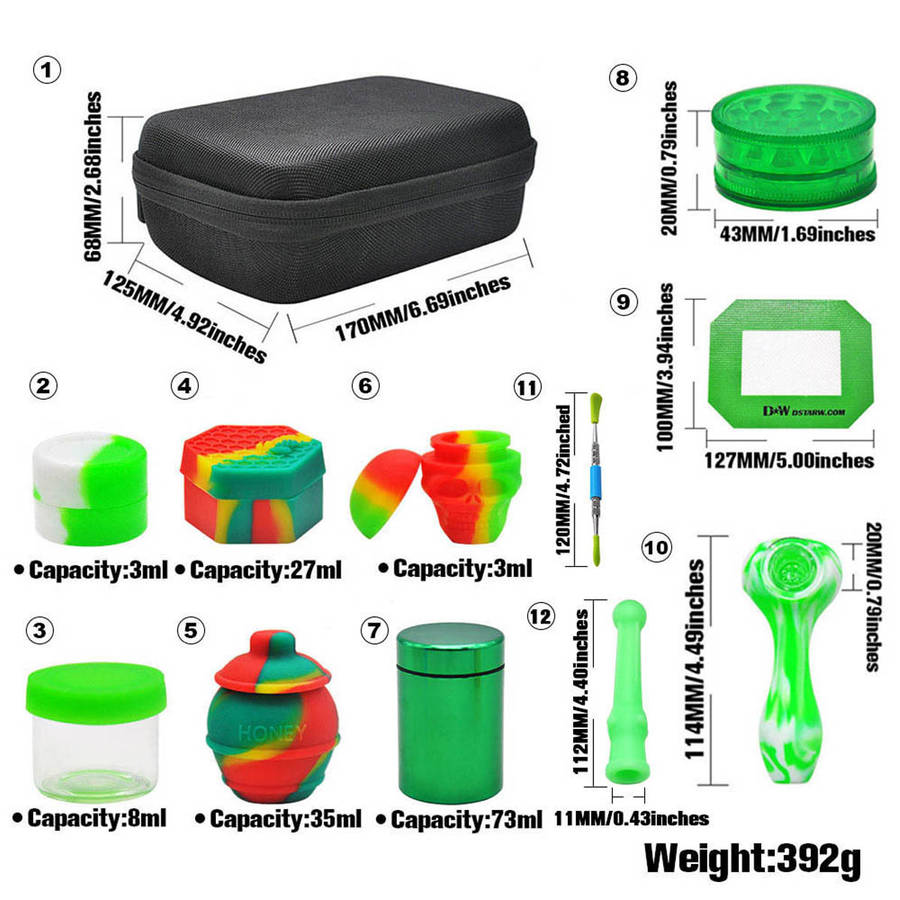Features : Unique appearance Multifunctional Tool Bag Multiple usage Complete accessories Easy to clean Great Gift to your Smoking Friend Specification : Material: Glass+Aluminium+Silicone+ Canvass Size: as picture shows Quantity:12pcs Package includeds : 1 x Storage box 1 x Silicone smoke oil box 3ml 1 x Silicone cover glass storage box 1 x Hexagonal honeycomb shape silicone smoke oil box 27mml 1 x Sugar can shape silicone oil smoke box 35ml 1 x Ghost Head Model Silicone Smoke Box 3ml 1 x Aluminum alloy metal storage tank 73ml (with seal ring moisture proof) 1 x Diameter 43mm3 layer plastic smoker 1 x Smoke oil operation panel (glass mat) 1 x Glass bowl silicone pipe 1 x Metall smoke spoon 1 x Smoke oil extractor (including titaniium nail) Details pictures :