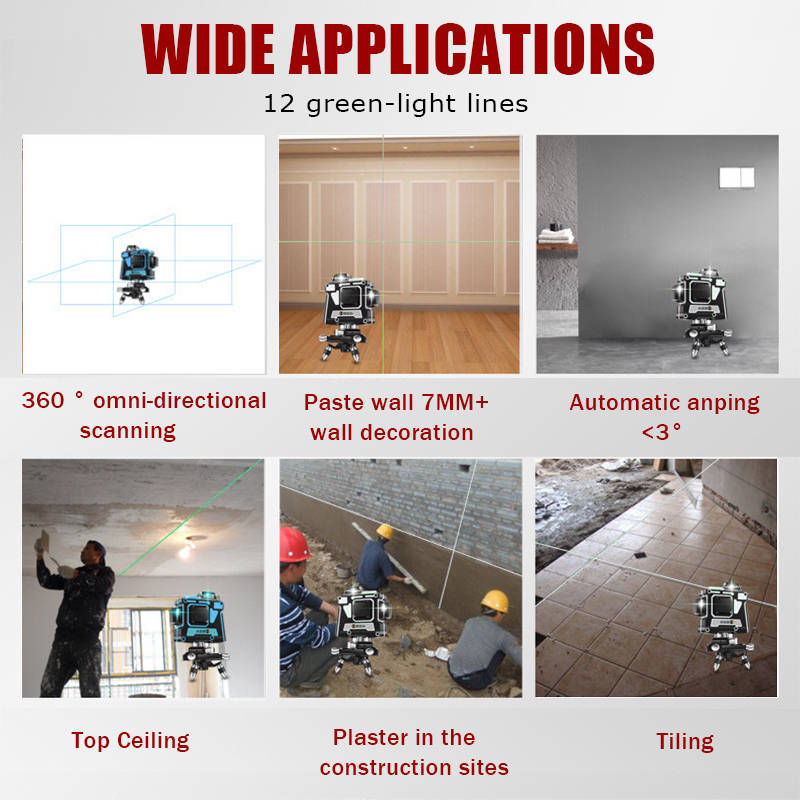 -3D 12 line laser wire fine positioning,suitable for different occasions to meet different engineering needs. Flexibility and stability. -Charging using. -Waterproof, wear-resisting,easy to operate. -Easy to carry with the case, providing quick and convenient mobility and storage. -Wide applications for auxiliary tiles fixing, wall decoration, floor tiles fixing, stair handrails,furred ceiling,floor tile,plastering.