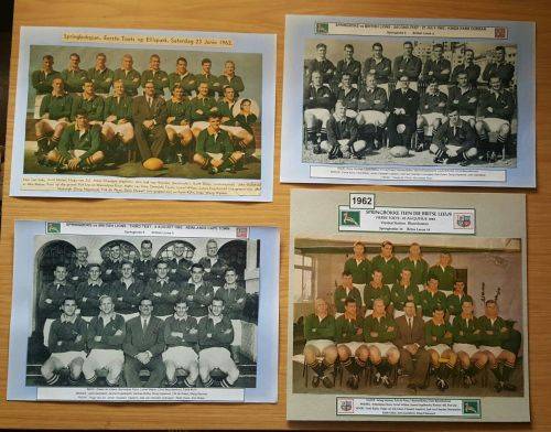 Below : Pictures of the four Springbok teams who played against the British lions in the four tests 1962. 1st Test : magazine picture, 2nd and 3rd tests : black and white photo prints, 4th test : magazine picture. Pictures of the first three test teams each glued to scrapbook pges measuring 350mm x 230mm. Fourth test picture glued to a board measuring 320mm x 305mm.