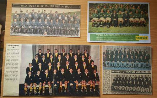 Below : Newspaper picture (380mm x 185mm)of the 1980 British Lions who toured South Africa, picture of the Springbok team - 1st test vs Australia 1963 - glued to a scrapbook page measuring 350mm x 230mm, 'Huisgenoot' magazine centre fold picture of the 1963 Australia (Wallaby) rugby team who toured South Africa - glued to a board measuring 505mm x 275mm, two newspaper pictures taken from different angles of the 1976 All Black team who toured South Africa - glued to a board measuring 260mm x 260mm.