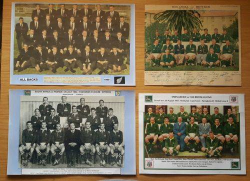 Below : 'Brandwag' magazine picture of the 1960 All Black rugby team who toured SA - picture is glued to a scrapbook page measuring 350mm x 230mm, magazine picture (275mm x 230mm) with printed autographs of the Springbok team vs British Lions - 4th test 1955, magazine picture of the Springbok team vs British Lions - 2nd test 1955 - glued to an A4 size board, black and white photo print of the Springbok team vs France 1964 - glued to a 350mm x 230mm scrapbook page.