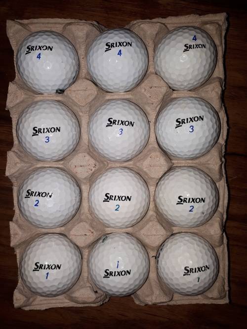 12 Srixon second hand golf balls. Numbered in blue and one ball in green 3 number 1's, 3 number 2's, 3 number 3's and 3 number 4's. The balls are in excellent condition, with almost no damage to the balls (as can bee seen on the pictures). The unique design of the Srixon golf ball is that it assists the amateur golfer with long drives and minimum spin on the fairway. It creates good spin on the short game allowing the ball break sharply on the green. Excellent buy.