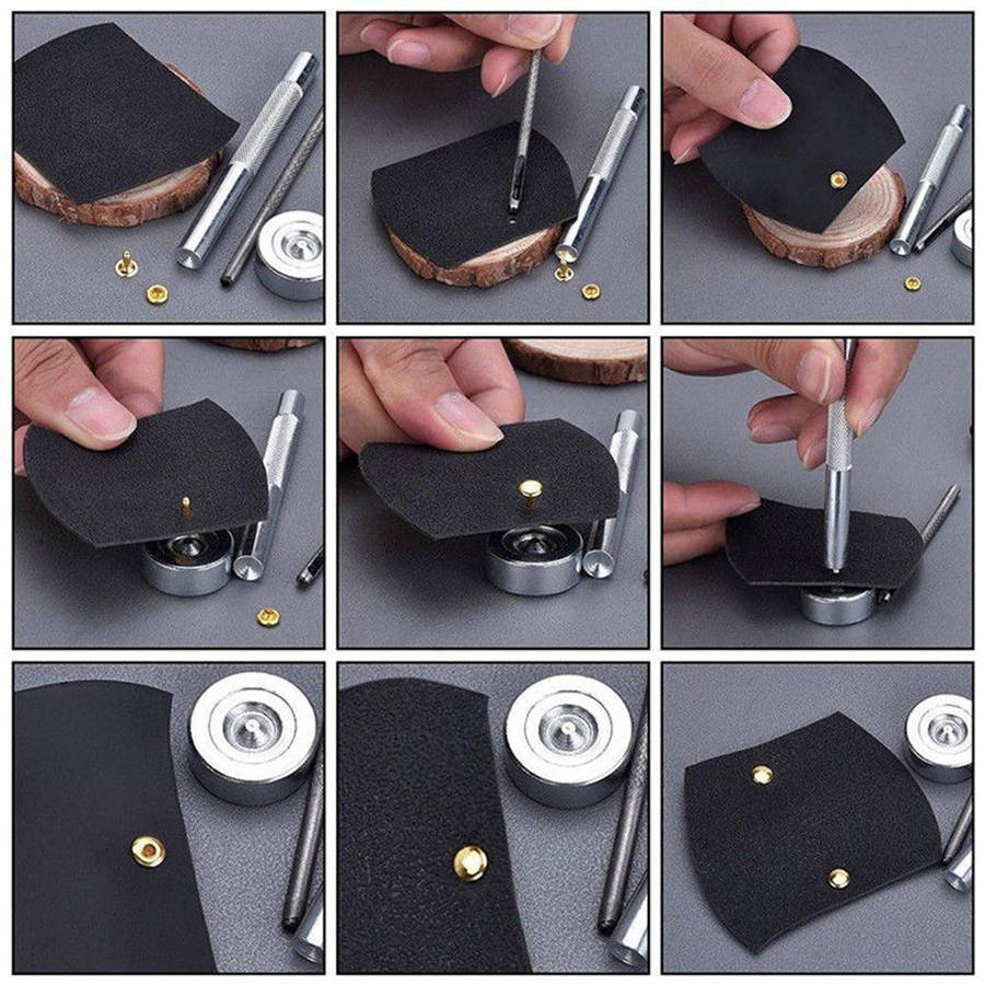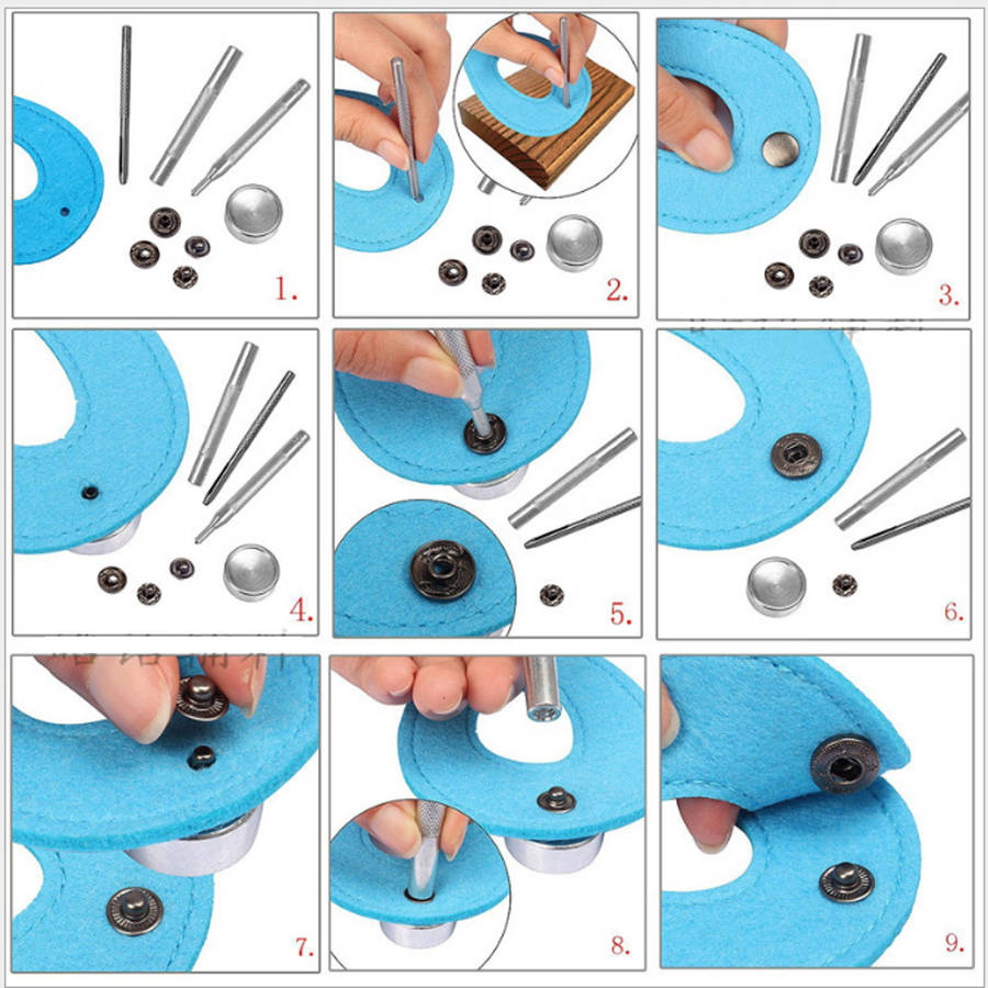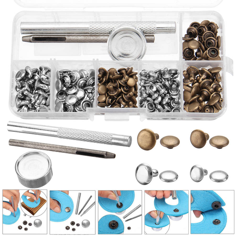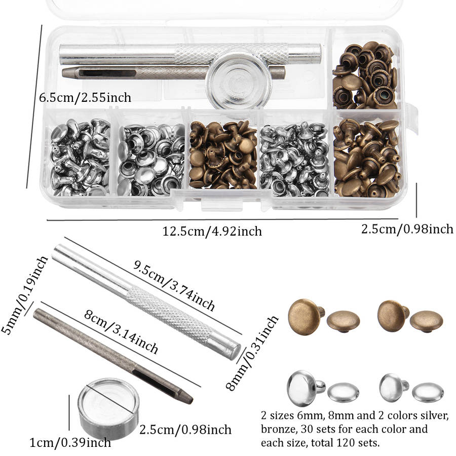 Feature: - Includes 2 sizes 6mm, 8mm and 2 colors silver, bronze, 30 sets for each color and each size, total 120 sets.Each set of rivet includes 2 parts: a cap and a stud. - Wide range of applications: These metal rivets are suitable for DIY projects, homemade or clothing such as wristbands, hats, jeans, belts, shoes, jackets, etc. - Easy to store: All the 120 buckles and mounting tools are placed in a clean storage box with a removable bezel to separate these compartments for quick and easy access to what you want. - Installation Instructions - First, use a punch tool to punch a hole in the target product. Then, hammer and push the buckle on both sides. Finally, lock the mechanism firmly together.