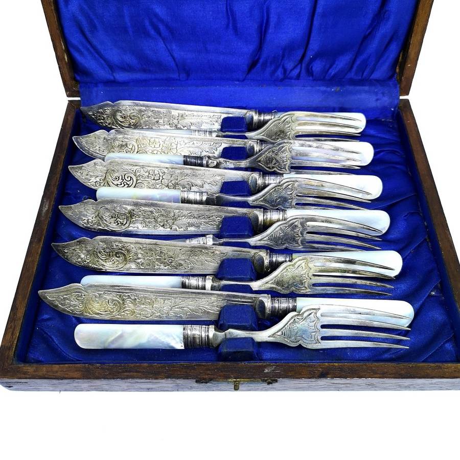 120 Year old | Fish Fork and Knife Set | EPNS | MOP | Mother Of Pearl Handles | Engraved Details