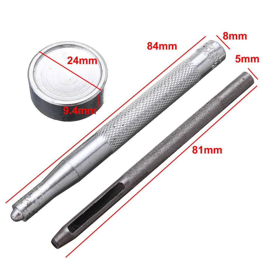 Specifications: Material: Metal Cap diameter: 15mm /0.59inch Round base diameter:24mm/0.9inch Punching tool length:81mm/3.2inch Hammer length:84mm/3.3inch Color: Silver-White Quantity:120pcs 30 Set