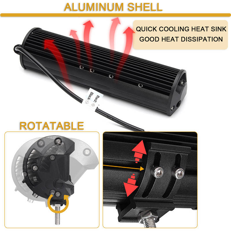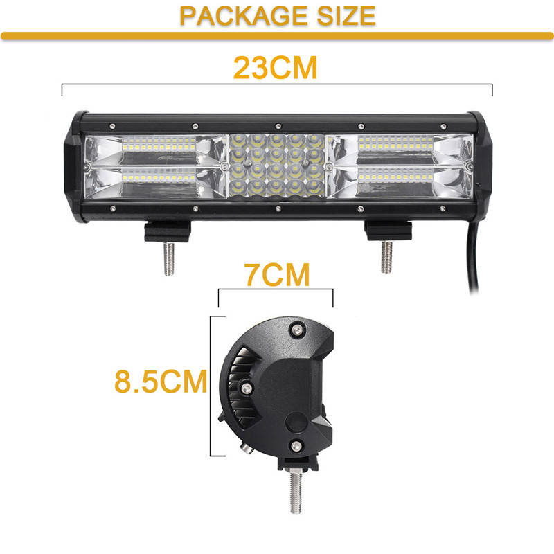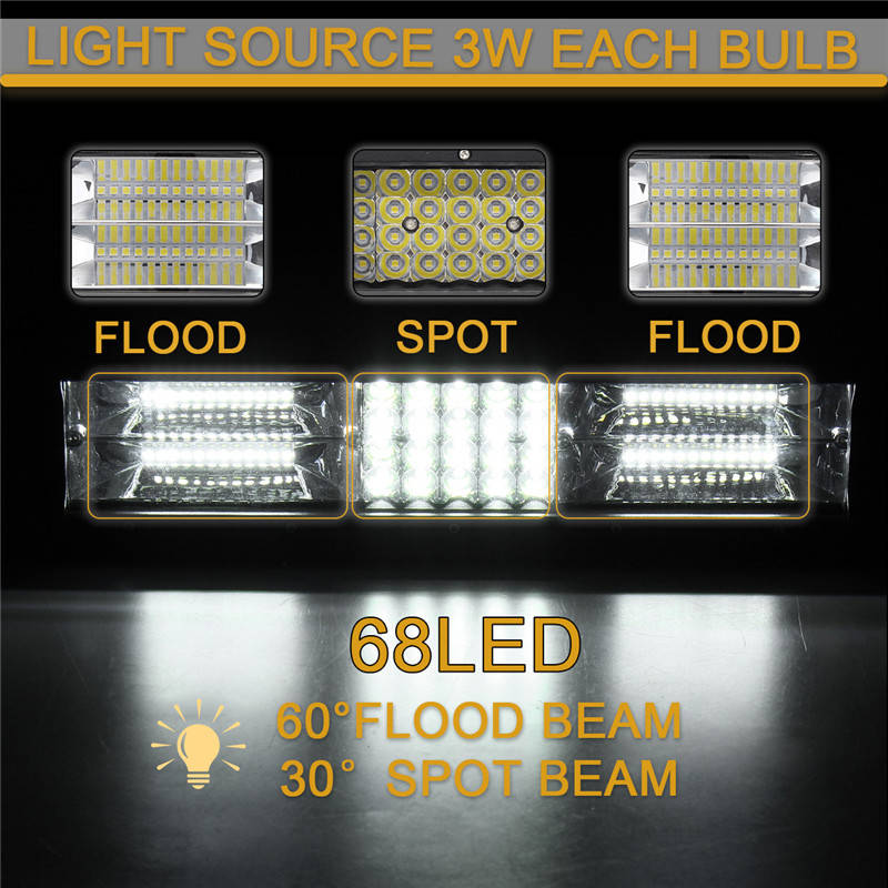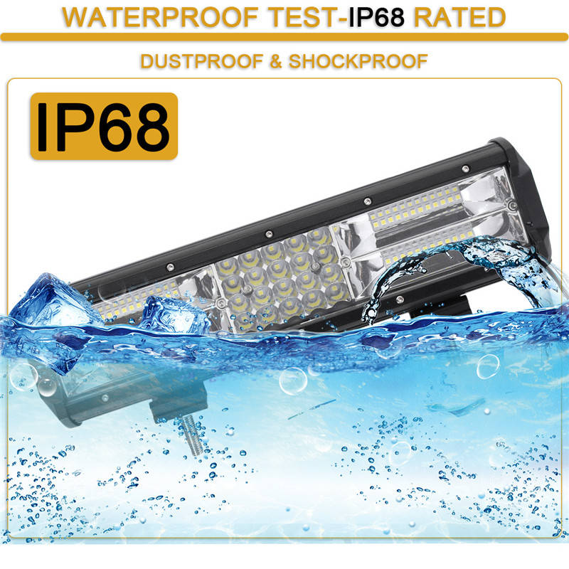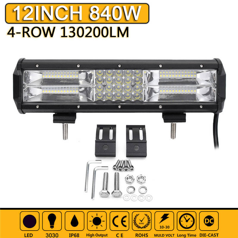Description: Quad-Row LED Light Bar Combo flood beam (60 degrees) and spot beam (30 degrees) pattern Water resistant and anti-corrosion, can be used in the rain or harsh environments Aluminum Housing, back of the housing has large integrated heat sinks for optimized heat dissipation Long LED lifespan (50,000+ hours) low power consumption and high lumen output and stable performance Specification: Power: 840W Luminous Flux: 130200LM Working Voltage: DC 10~30V (fits 12V,24V vehicles) Number of Chips: 68pcs Intense 3030 LED Chips Protection Rate: IP68 Waterproof Color Temperature: Pure White 6000K-6500K High Power Working Temperature: -40~85 degree Celsius Beam Angle: Flood (60ᆪ) + Spot (30ᆪ) Combo Beam Material: Extruded Aluminum Profile, High transmission PC Lens Mounting Bracket: Aluminum Angle Adjustable Mounting Life Time: > 50,000 Hours Package Included: 1 X LED Light Bar 1 X Accessory Mounting Kits