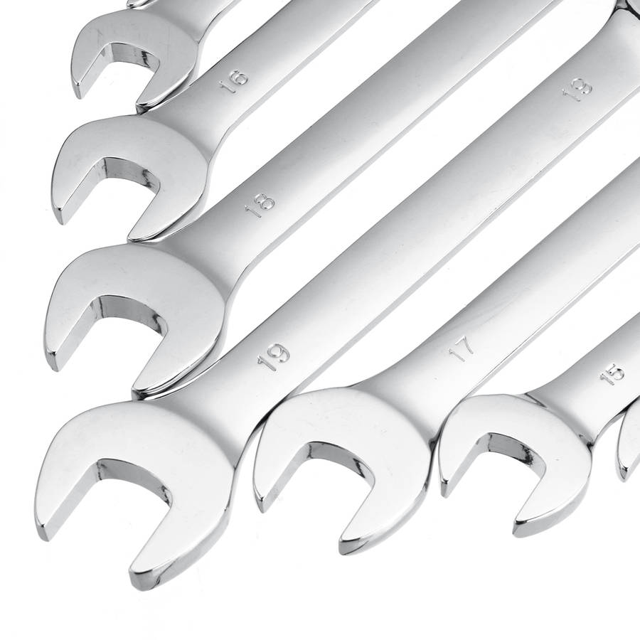 Feature: - 12 tooth ratcheting box end needs a minimal 5?ᆪ to move fasteners vs. 30?ᆪ for standard wrenches.? - Off-corner loading design on box end provides better grip and reduces fastener rounding.? - Thin head and beam provide greater access in confined work areas. - Flexible head provides access to hard-to-reach bolts and fasteners. - Size conveniently stamped on both ends of the beam for quick identification. Specification: 1.Chrome Vanadium Steel? 2.Pressure and Erosion Resistant? 3.Suitable for Long Time Industrial Usage? 4.Anti Corrosion/Slip Surface? 5.mainly used in auto repair machine repair. Package Included: 12 x Wrench (8mm,9mm,10mm,11mm,12mm,13mm,14mm,15mm,16mm,17mm,18mm,19mm) 1 x Storage bag