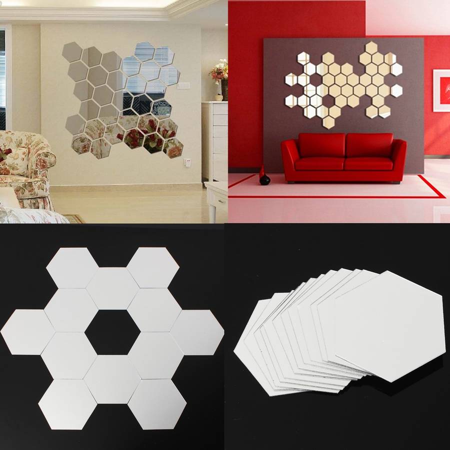 12Pcs Mirror Wall Sticker Hexagon Removable Acrylic 3D Mirror DIY Home Room Decor Art