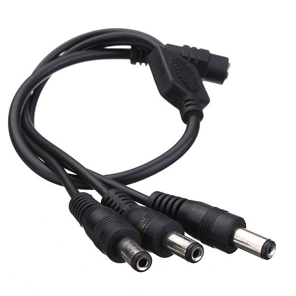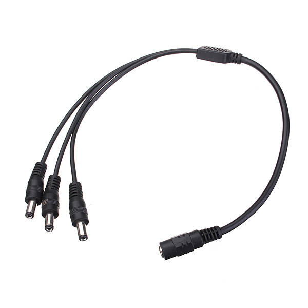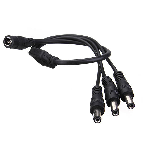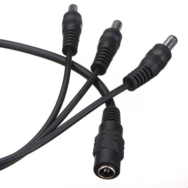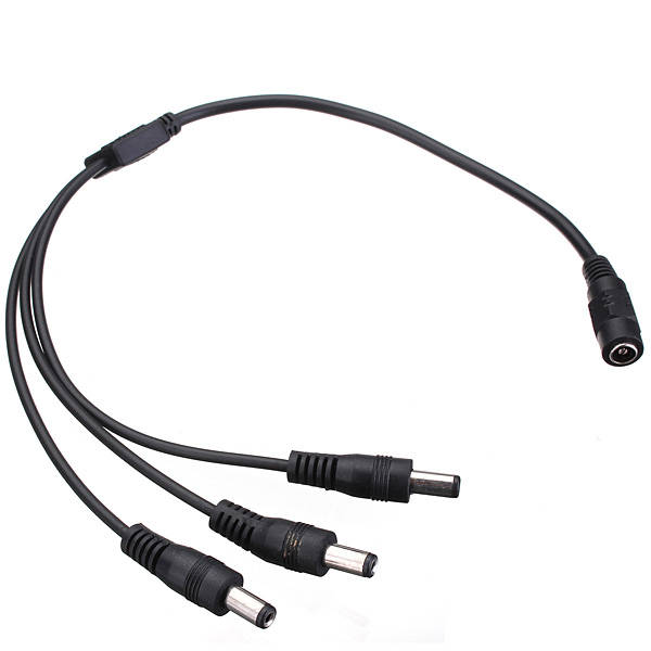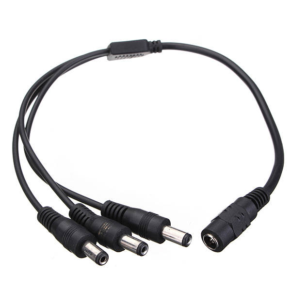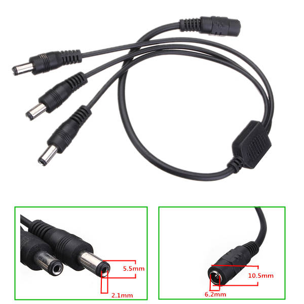 Feature: Convenient and cost effective way to power up 3 strips/cameras with 1 power adapter This DC Power Adapter Cable Pigtail splits 1 power signal into 3. Allows three strips to run off the same power source. Specification: Color: Black Type: 1 Female to 3 Male Material: Plastic External 1 Female: Inner 6.2mm, Outter: 10.5mm 3 Male: Inner 2.1mm, Outter: 5.5mm Total Length: Approx: 40cm Package Include: 1 x Adapter cable