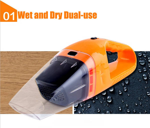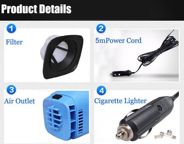 Material: Plastic & Metal Color: Orange, Blue, Black Size: 35cm x 9cm x 11cm (Approx.) Rated Voltage: DC12V Power: 120W Vacuum Degree: 4000Pa Cigarette Lighter Connector Cable Length: 5m( It Can be used in the trunk.)