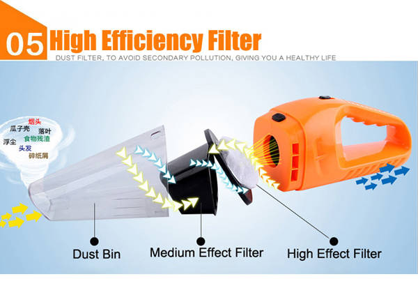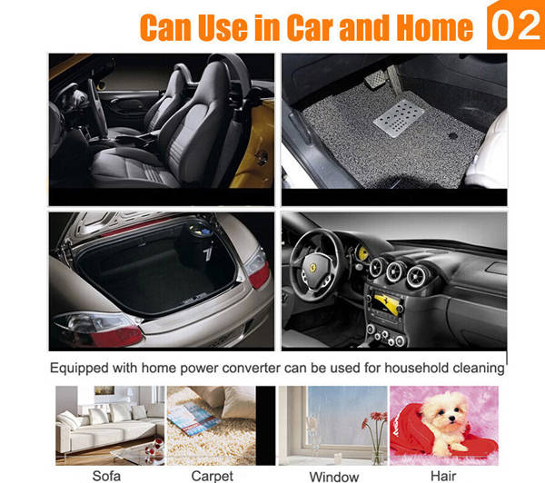 1. Used directly from the car lighter socket 2. Controlled by ON / OFF switch, easy to use 3. Powerful suction, Low noise 4. Compact, handy and lightweight 5. Complete with convenient attachment and washable filter 6. Perfect for home, office, school, travel and all vehicles 7. Can suck cigarette ash, cookie crumbs, eraser crumbs, hair, rice, wastepaper, etc