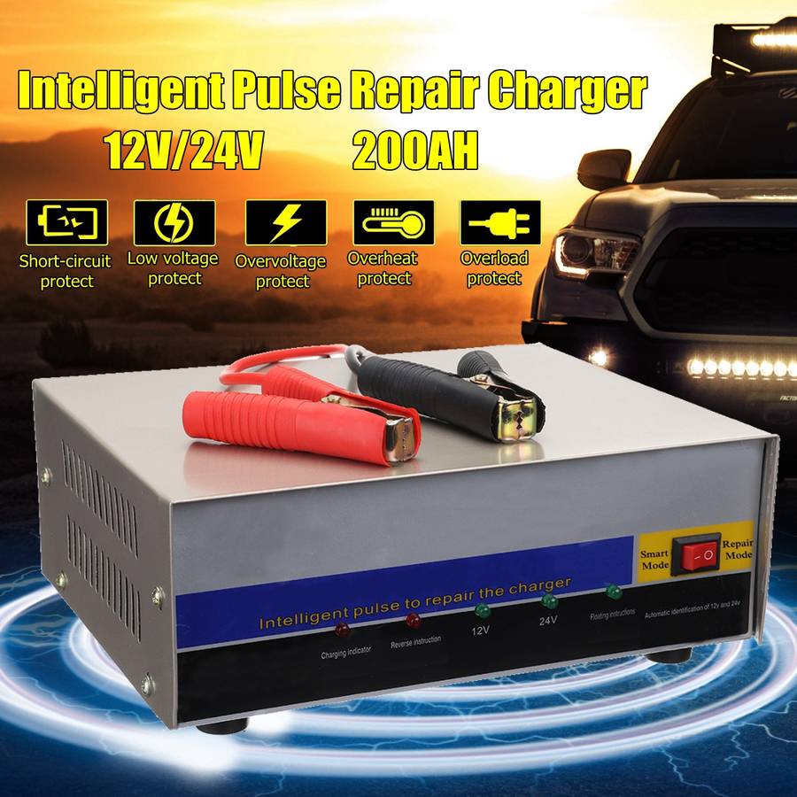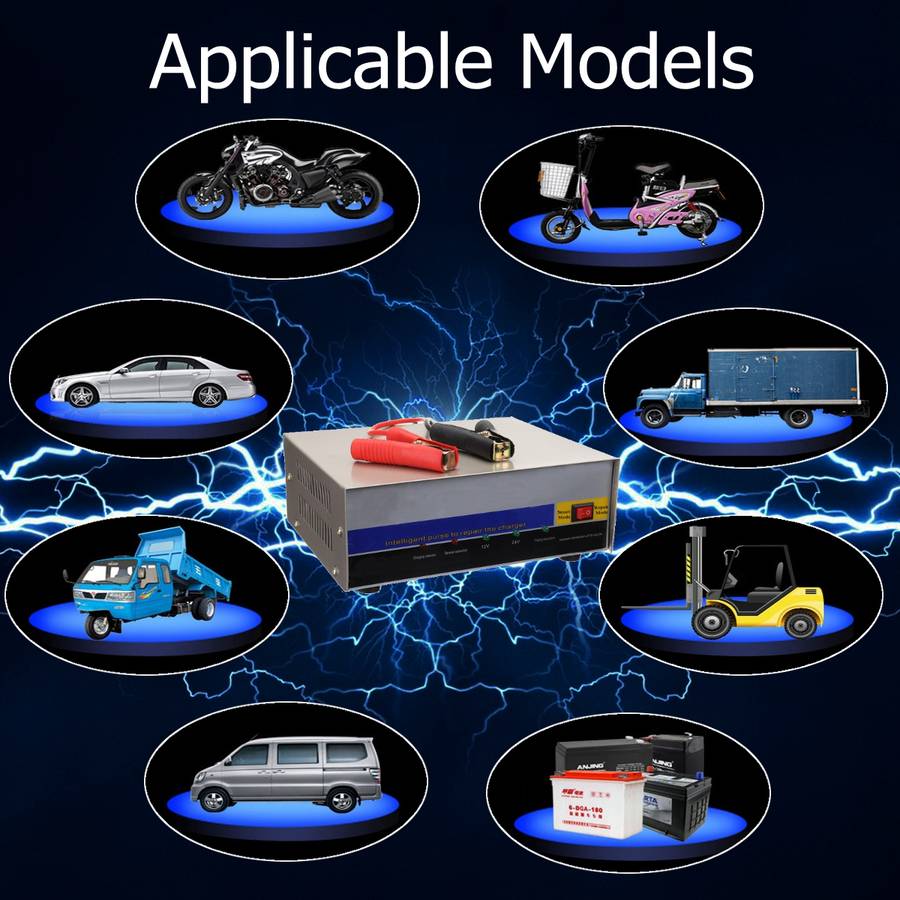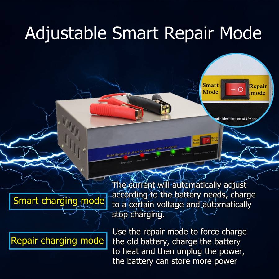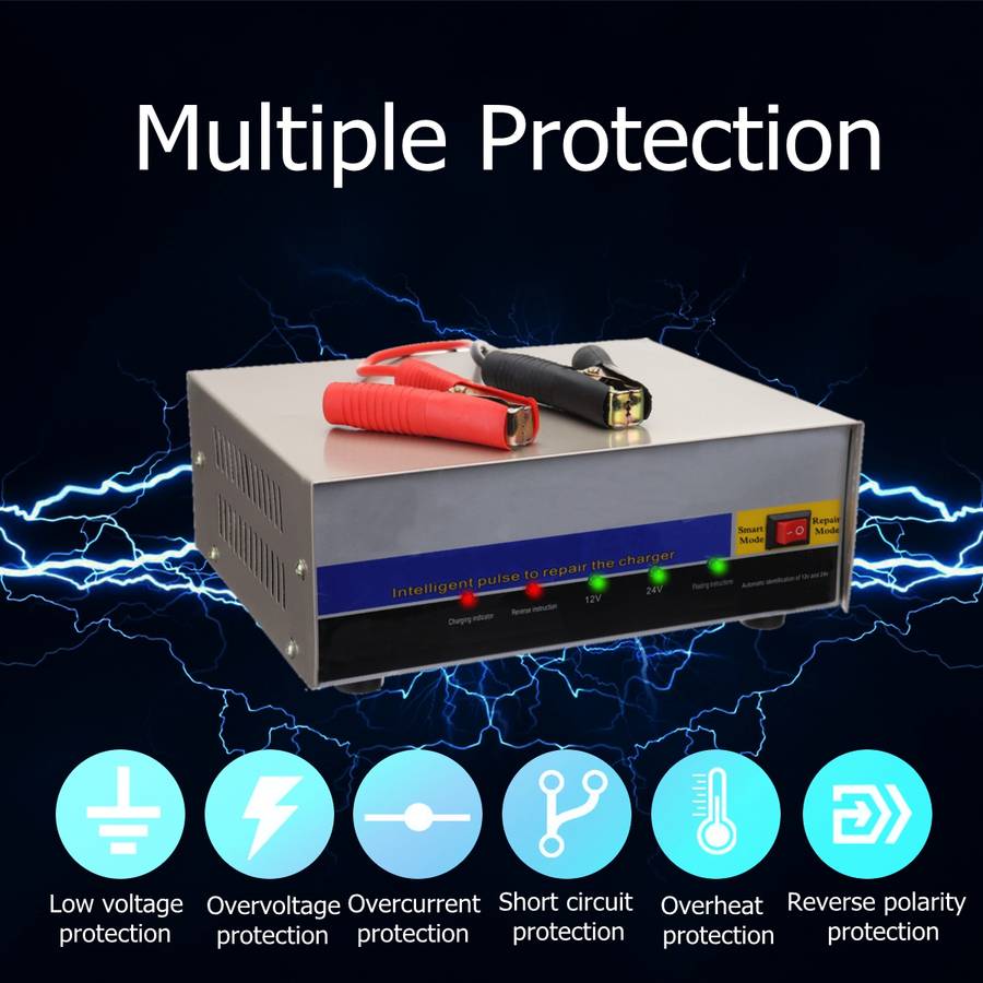 12V24V Car Battery Charger Intelligent Pulse Repair Charger Voltage Automatic Identification 6AH-200AH Features: 1. Multiple protection Short circuit protection, Reverse connection protection, Intelligent Recognition, 0 volt start, Saturation indication