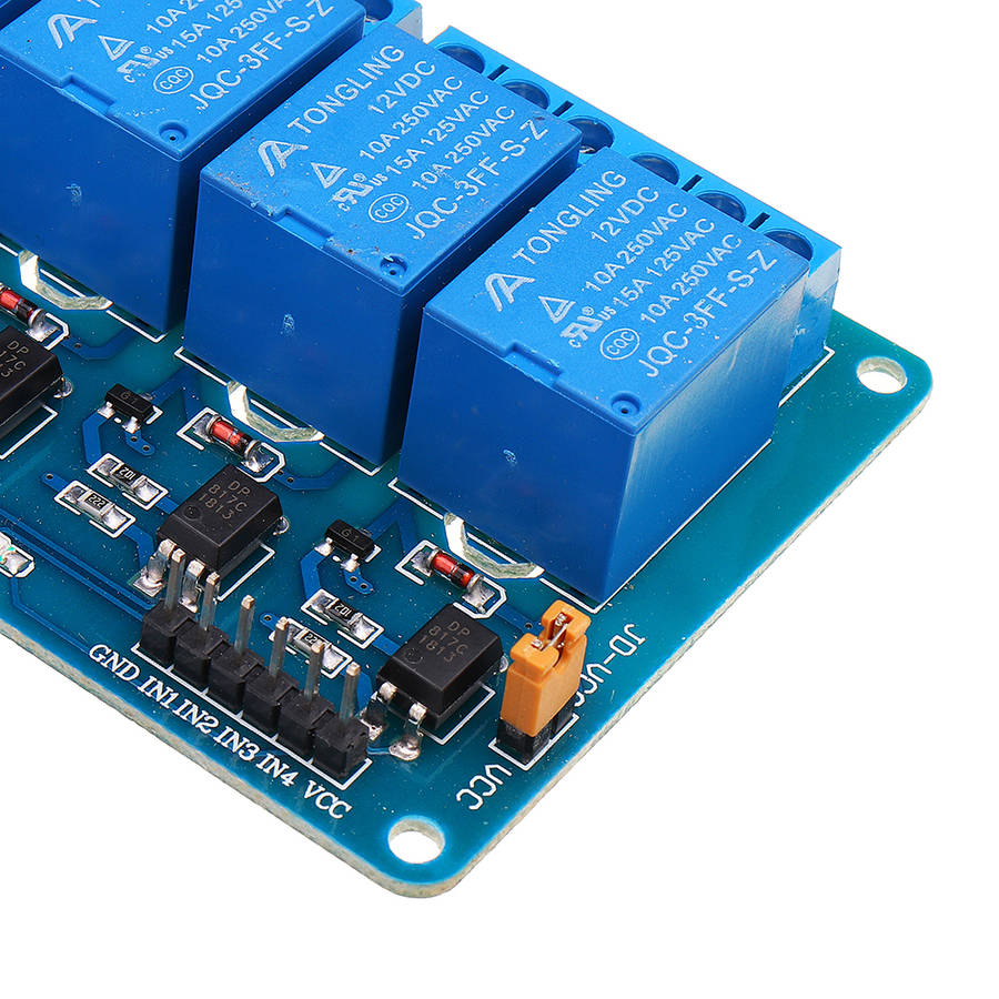 Input IN1, IN2, IN3, IN4 signal lines are valid at low levels. VCC, GND power input terminal, can be relay alone power supply relay power input JD-VCC.